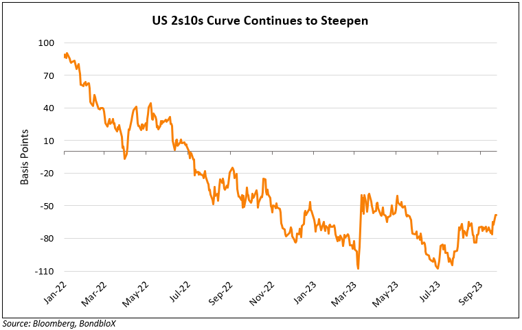 US Treasury yields resumed their surge with long-end yields leading the curve to bear steepen – US 10Y yields rose 10bp to 4.56%, a level last seen in 2007 while the 2Y yield rose 3 bp to 5.15%. The 2s10s curve has now steepened to -58bp, levels last seen in May post which the curve inverted further to lows of -109bp. Analysts note that the sell-off in Treasuries is said to come on the back of multiple factors including a ‘higher for longer’ theme on interest rates alongside an increase in supply of treasuries through the quarter as the US Treasury Department is targeting an increase in cash balances to $750bn at year-end. Separately, the Republican-controlled House of Representatives is expected to advance steep spending cuts this week. However, this is unlikely to be passed due to lack of sufficient support and could lead to a partial shutdown of the US government by next Sunday. In credit markets, US IG CDS spreads were 0.5bp wider while HY spreads widened by 1.3bp. The S&P and Nasdaq rose by 0.4-0.5% on Monday.