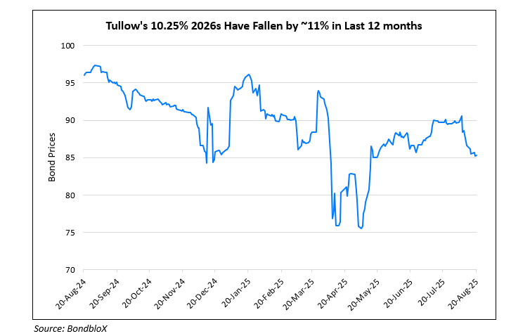 Tullow’s 10.25% 2026s are currently trading at 85.26, yielding 34.45%.