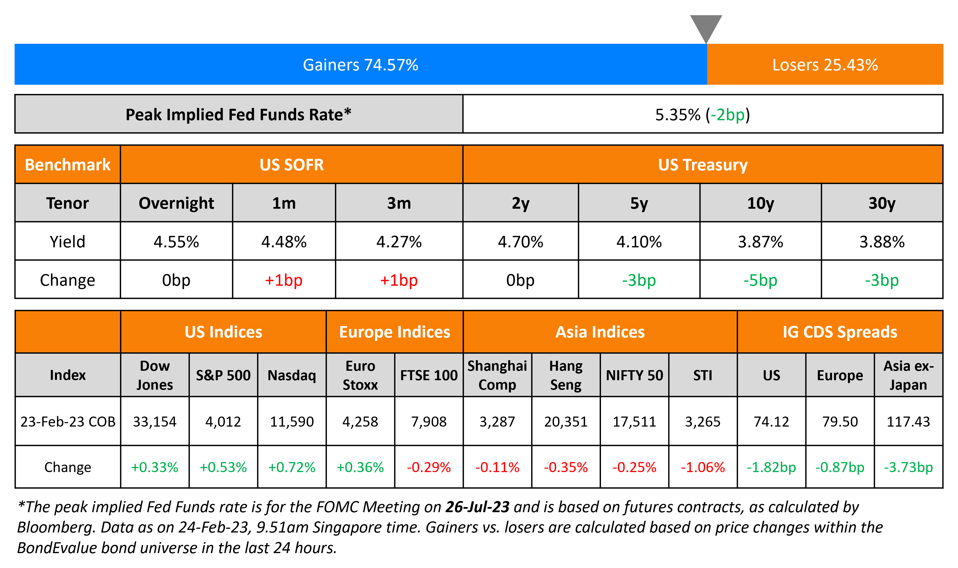 US Treasury yields eased 3-5bp across the mid-to-long end of the curve with the peak Fed funds rate down 2bp to 5.35% for the July 2023 meeting. US Q4 GDP came at a revised 2.7%, lower than the preliminary number of 2.9%. Markets are pricing in a 27% chance of a 50bp hike in March vs. just over 9% a week ago. Going by the maximum probabilities, markets are pricing in 25bp hikes at each of the next three Fed meetings in March, May and June. US IG and HY CDS spreads tightened by 1.8bp and 9.1bp. The S&P and Nasdaq ended the day higher, up by 0.5% and 0.7% respectively on Thursday.