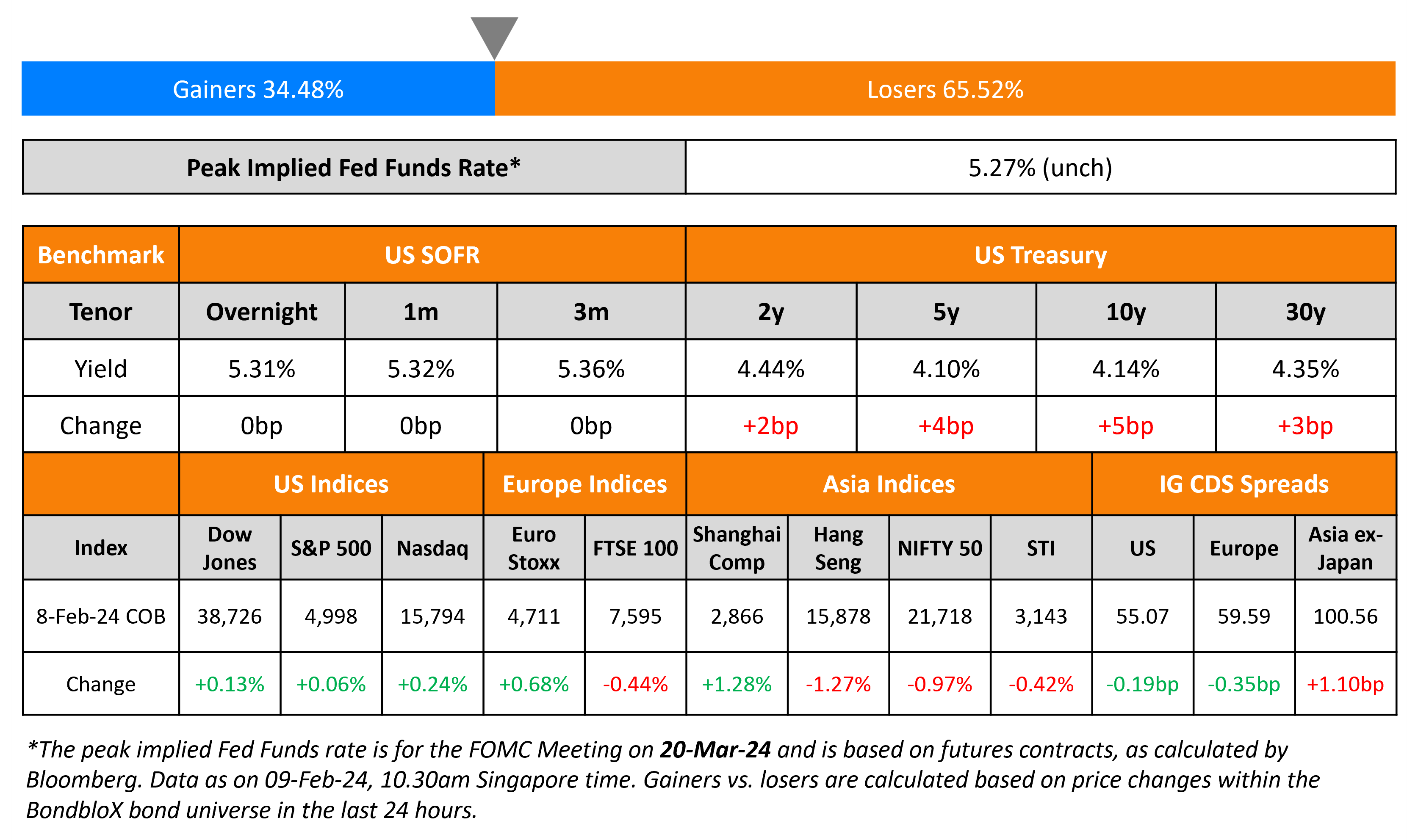 US Treasury yields continued to inch higher on Thursday with the 10Y up 5bp. US initial jobless claims fell for the first time in three weeks by 9k to 218k in the week ended February 3, below estimates of 220k. Looking at credit markets, US IG and HY CDS spreads tightened 0.2bp and 2bp respectively. S&P rose 0.1% and Nasdaq rose 0.2%