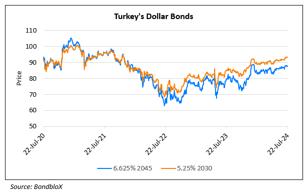 Due to unorthodox monetary policy, Turkey’s dollar bonds had seen a massive drop in prices from the beginning of January 2021, through July 2022. It’s dollar bonds have been on an uptrend since then with their prices reaching near pre-covid levels as seen in the chart above.