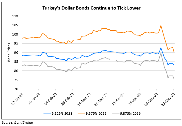 Dollar bonds of Turkey fell by 1.5-2 points across the curve after its third-place election candidate Sinan Ogan endorsed his support for Erdogan in the runoff vote coming Sunday. Sinan Ogan’s won 5.2% of voters’ support in the initial presidential election on May 14. He said that Erdogan’s rival Kilicdaroglu’s Nation Alliance party “failed to convince us about the future”. During the initial May 14 elections, the incumbent Erdogan got 49.5% support vs. Kilicdaroglu who got 44.9%.