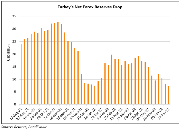 Turkey’s central bank net forex reserves fell from $8.15bn a week ago to $7.38bn, the lowest it has been in 20 years. The dwindling reserves are expected to raise investors’ concerns over the country’s ability to service its sovereign debt. Reuters notes that in recent years, Turkey’s forex reserves have dropped significantly, most recently due to considerable market intervention during its currency crisis in December 2021. The Turkish Central Bank has since sold $30bn of its forex reserves into the market since December, on top of $128bn in 2019-20, to support the lira. Despite selling reserves to keep the lira up, the Turkish currency still lost 44% of its value against the dollar last year and has further dropped 24% so far this year. While the central bank has been trying to curb the fall in the lira with reserves, the monetary policy on interest rates is divergent – cutting rates even as inflation has soared.