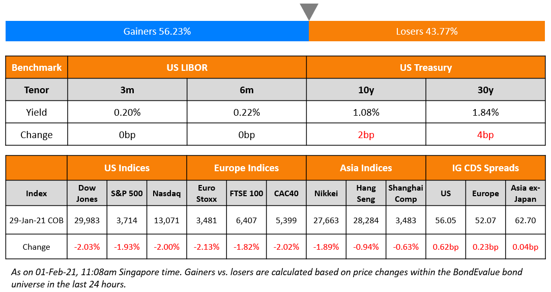 US primary market issuances were at $40.1bn vs $39.6bn in the week prior – IG issuances stood at $25.3bn and HY at $14.9bn, down 8% and up 11% respectively WoW. The region saw the largest deal of 2021 yet with US convenience chain 7-Eleven raising $10.95bn via an eight part deal. In North America, there were a total of 49 upgrades and 84 downgrades combined, across the three major rating agencies last week. LatAm saw only $900mn worth of new dollar bond deals in the week vs $7.1bn in the week prior with Mexico’s Financiera alone raising $400mn. EU Corporate G3 also saw a decline in issuance with $18.1bn of new deals vs $25.4bn in the week before, down 29% – Credit Suisse’s $1.65bn topped the list followed by Austria’s Oesterreichische Kontrollbank’s $1.23bn issue. GCC dollar issues were at $6.15bn, up 36% compared to the previous week, led by Saudi Arabia raising $5bn via a dual-trancher and Oman Electricity Transmission Company raising $600mn. APAC ex-Japan G3 issues totaled $13.1bn vs $9.5bn in yet another busy week, up 38% WoW. Last Tuesday saw 10 deals and Wednesday another 7 – Hong Kong SAR led with its three-trancher raising $2.5bn, Hong Kong Airport Authority at $1.5bn, ANZ at €750mn ($908mn) and CMB Financial Leasing at $800mn via a two-trancher. Besides Chinese issuers dominating the primary markets, Indian corporates Adani Ports and GMR Hyderabad Airport also sold dollar bonds raising $500mn and $300mn respectively. In the region, there were a total of 2 upgrades and 10 downgrades combined, across the three major rating agencies last week. Among the notable downgrades was that of China Fortune Land (CFLD) by Fitch, their second downgrade by the rating agency this month, with its dollar bonds topping the losers list.