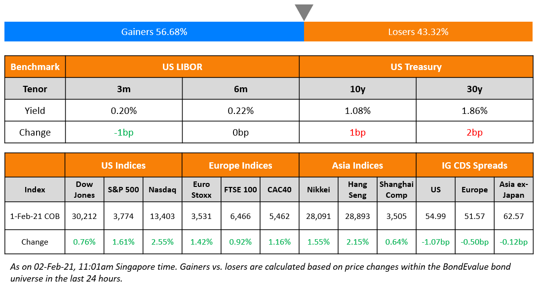 S&P was 1.6% higher while Nasdaq rallied 2.6% as tech stocks outperformed. Amazon and Microsoft were among the large-cap gainers, up 4.3% and 3.3% besides Tesla moving higher by 5.8%. Mining stocks were also in demand after the Gamestop saga with the focus now on silver, which soared to eight-year highs. US 10Y Treasury yields inched up 1bp. A possible smaller fiscal package, ISM manufacturing index printing at 58.7 for January vs. 60.5 in the month before and the US Treasury reducing Q1 borrowing due to higher cash balance made the headlines in the US. There is speculation that former ECB president Draghi could become the next Italian prime minister. FTSE, DAX and CAC also rose 0.9%, 1.4% and 1.2% respectively. US IG CDS spreads were 1.1bp tighter and HY was 7.1bp tighter. EU main CDS spreads tightened 0.5bp and crossover spreads tightened 1bp. Asia ex-Japan CDS spreads are 0.1bp tighter while Asian equities are ~1.2% higher today.