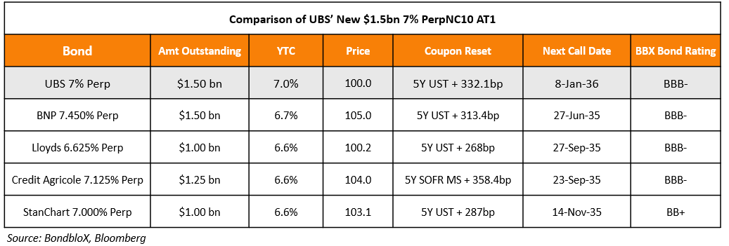 UBS raised $3bn via a two-trancher. It raised $1.5bn via a PerpNC5 AT1 at a yield of 6.625%, 50bp inside initial guidance of 7.125% area. It also raised $1.5bn via a PerpNC10 AT1 at a yield of 7.0%, 50bp inside initial guidance of 7.5% area. The junior subordinated notes are rated Baa3/BBB-/BBB-. The tables give a comparison of UBS’ new AT1 issuances with its peers.
