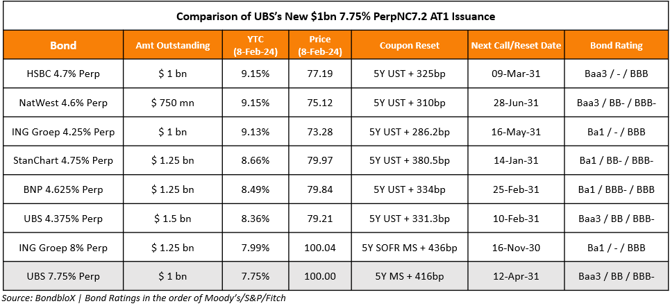 UBS raised $1bn via a PerpNC7.2 bond at a yield of 7.75%, 62.5bp inside initial guidance of 8.375% area. The subordinated notes are rated Baa3/BB/BBB-. The coupons are fixed until the first reset date of 12 April 2031, and if not called by then, it resets to the 5Y MS plus a margin of 416bp. Above is a table comparing the latest UBS 7.75% Perp with other European bank AT1s.