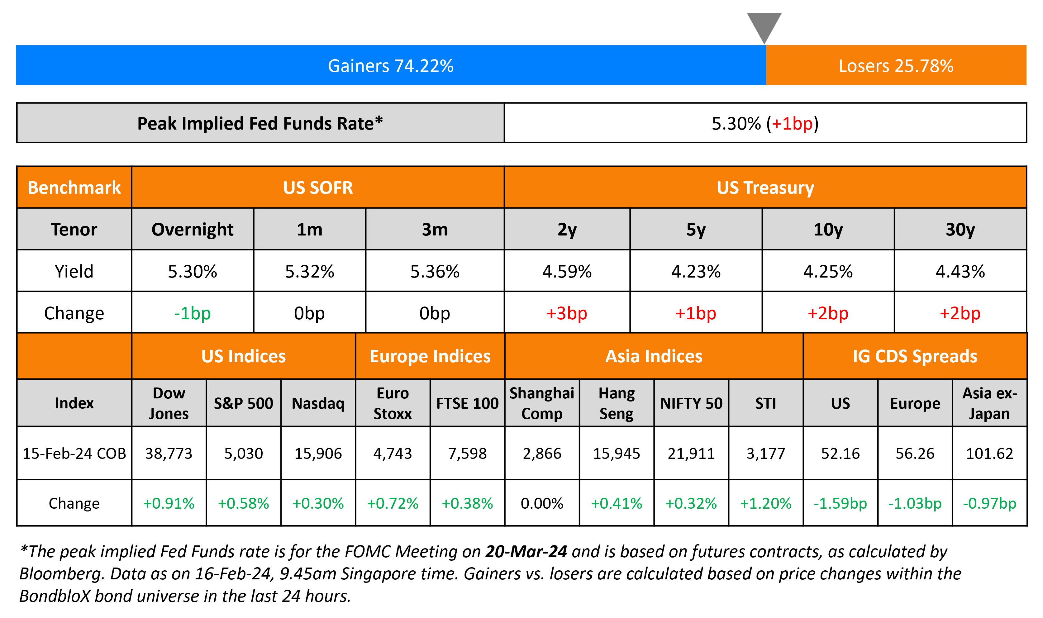 European equity markets ended higher too. Credit markets in the region saw the European main CDS spreads tighten by 1bp and crossover spreads tighten by 2.6bp. Asian equity markets have opened in the green today. Asia ex-Japan IG CDS spreads widened by 1bp. Japan’s economy slipped into recession after shrinking for a second consecutive quarter due to pale domestic demand. GDP contracted at an annualized pace of 0.4% in the final quarter of 2023, following a revised 3.3% retreat in the previous quarter.