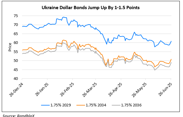 Ukraine’s dollar bonds jumped by 1.0-1.5 points across the curve. There was no major news that could be attributed to the move in its bonds, however there were certain developments on the Russia-Ukraine war front. US President Donald Trump signaled a possible willingness to provide more Patriot missiles to Ukraine following his meeting with Ukrainian President Volodymyr Zelensky during a NATO summit. Zelensky emphasized Ukraine’s urgent need for air defense amid escalating Russian missile attacks, particularly on its cities. While Trump left open the option of additional military or financial aid to Ukraine, he made no firm commitments. He also mentioned plans to speak again with Russian President Vladimir Putin on ending the war.