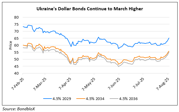 Ukraine’s dollar bonds have been on an uptrend since late-July as shown in the chart above. For instance its 4.5% 2035s have rallied by ~12% since July 28 to currently trade at 55.7, yielding 12.7%.