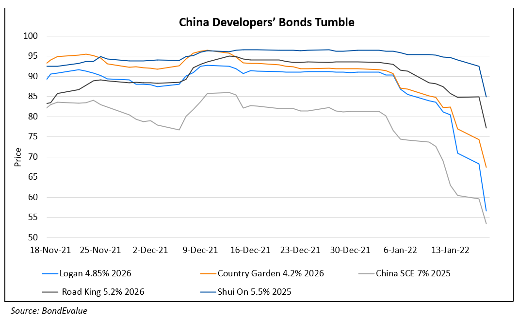 Chinese property developers’ bonds took another beating on Monday led by Logan Group, whose bonds fell ~15 points after Debtwire reported that the developer could have $812mn worth of hidden guarantees on outstanding debt obligations through 2023. While Logan denied the Debtwire report and speculation that it had privately sold debt, most of its dollar bonds fell to ~55-60 levels from ~90 levels in early January. The selloff was driven by investor concerns over transparency at China’s higher-rated developers (Logan BB/Ba2/BB, Country Garden BB+/Baa3/BBB-) with heightened risks over hidden liabilities receiving preferential treatment in repayment over offshore bonds. Country Garden, China SCE, Road King and Shui On led the losers with their dollar bonds falling 8-10 points since the start of the week.