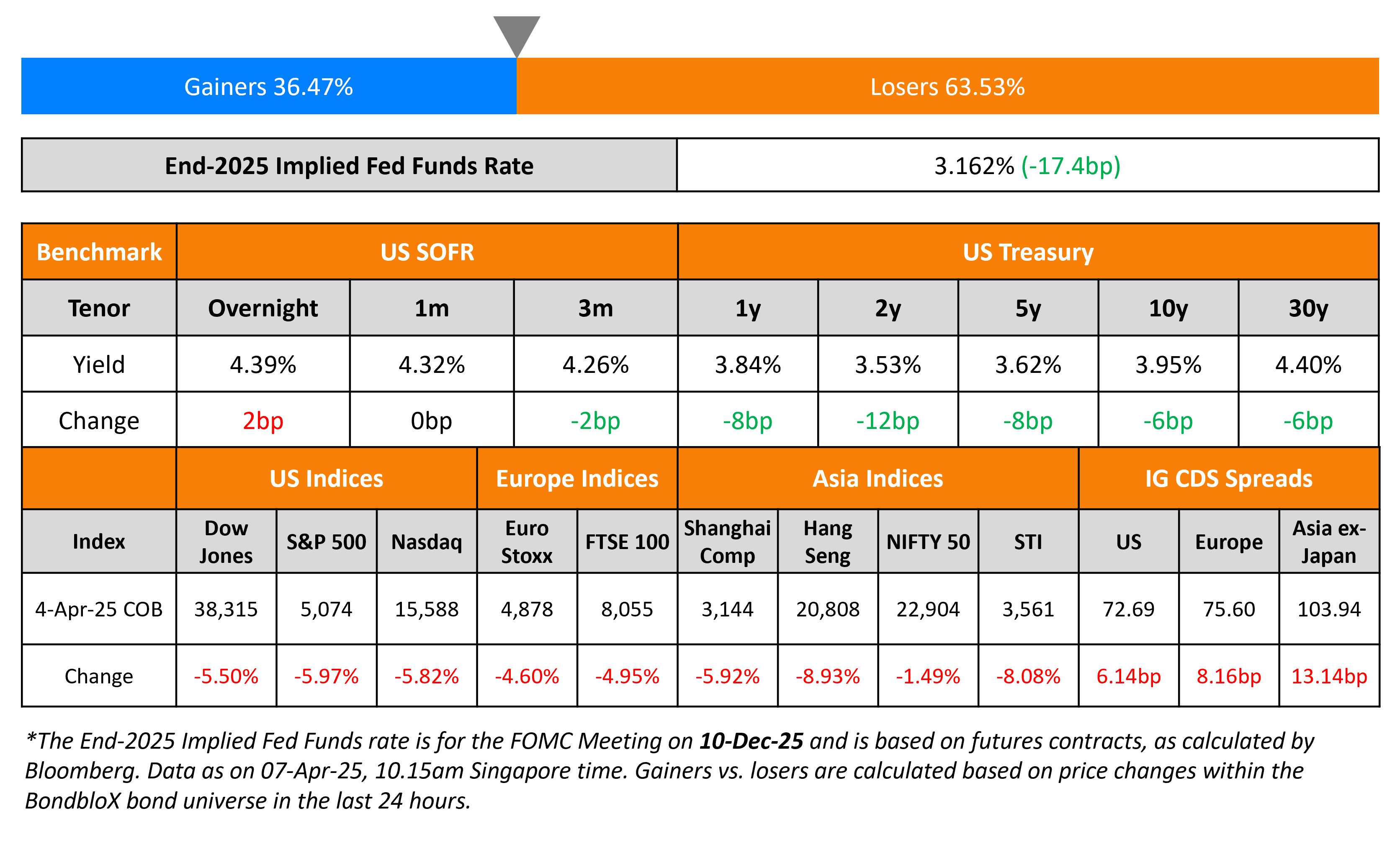 US Treasury yields dipped further, as the risk-off sentiment worsened. The 10Y yield fell below the 4%-mark for the first time since September 2024. On the data front, US Nonfarm Payrolls (NFP) for March came-in at 228k, better than estimates of 140k. However, February’s number was revised lower to 117k from 151k. Average Hourly Earnings (AHE) YoY rose 3.8%, softer than expectations of 4.0%. The Unemployment Rate edged higher to 4.2% from 4.1%. China announced that it will impose a 34% retaliatory tariff on all imports from the US, from April 10. Fed Chairman Jerome Powell continued to signal that there was no hurry to cut rates.