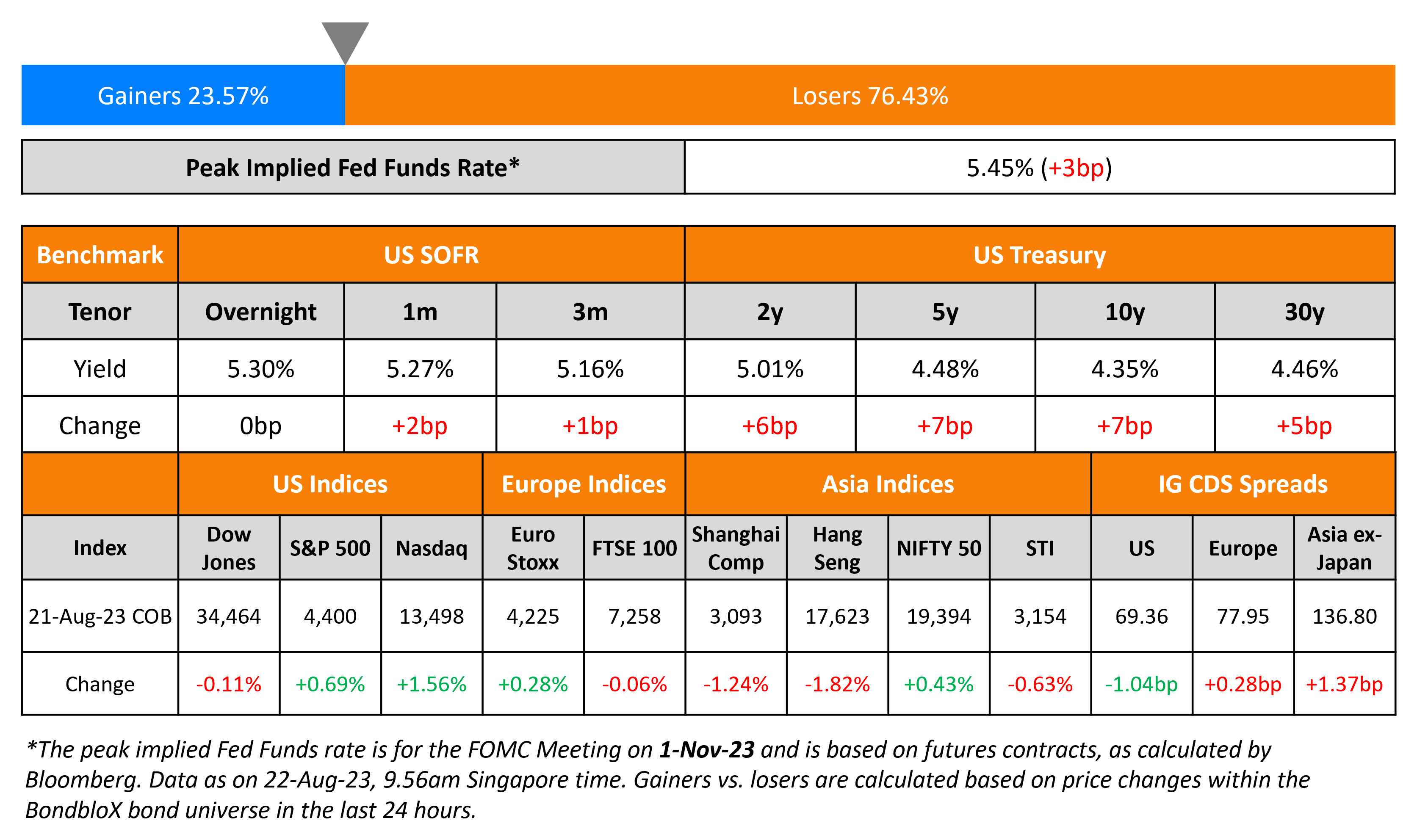 US Treasury yields jumped higher on Monday; the 2Y rose 6bp to 5.01% and the 10Y climbed to 4.35%, its highest since 2007 amid a broad sell-off in US debt. CME probability of a 25bp rate hike remains relatively unchanged at 14% for the September meeting, and 39% for the November meeting. US IG credit spreads were tighter by ~1bp while HY CDS spreads tightened by ~3.9bp. The S&P and Nasdaq closed higher by ~0.7% and ~1.6% respectively on the back of a rally in tech stocks.