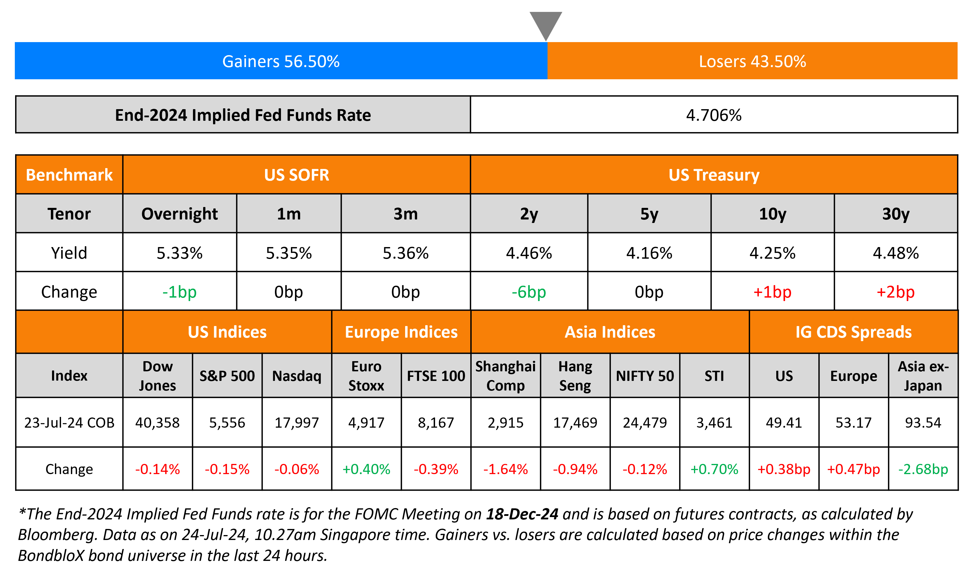Treasury yields were stable with no major data points emerging from the US. The US 2Y Treasury auction saw strong demand yesterday, with a bid-to-cover ratio of 2.81x vs. 2.75x last month and an indirect take-up of 76.6% vs. the prior 65.6%. The notes stopped through by 2.3bp at a yield of 4.434% with dealers taking up only 9%. Analysts note that the results indicate robust investor confidence in US Treasuries. US equities saw the S&P and Nasdaq end slightly lower, by 0.2% and 0.1% respectively. US IG and HY CDS spreads widened by 0.4bp and 0.8bp respectively.