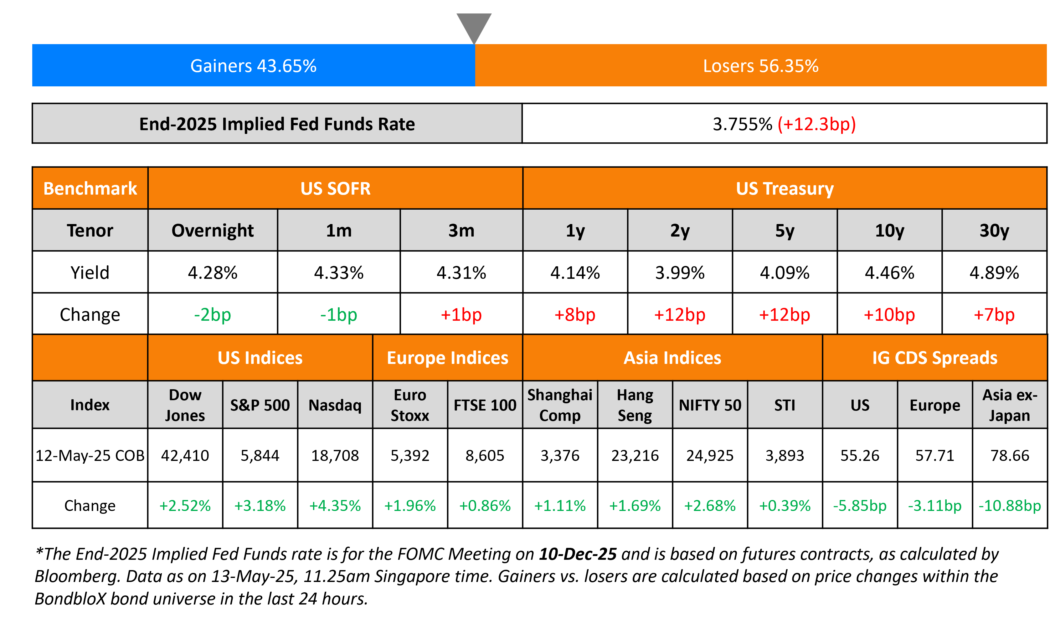 US Treasury yields jumped higher by 10-12bp across the curve, as global markets reacted favorably thanks to a significant de-escalation in the US-China trade dispute, albeit temporarily. Both nations agreed to a 90-day tariff reduction which will begin on Wednesday. The US will lower tariffs on Chinese goods to 30% from 145%, while China will lower tariffs on US imports to 10% from 125%. The agreement is set to expire in 90 days unless a more comprehensive trade deal is reached. Also, market expectations for Fed rate cuts fell from nearly three cuts to a little over two cuts by end-2025.