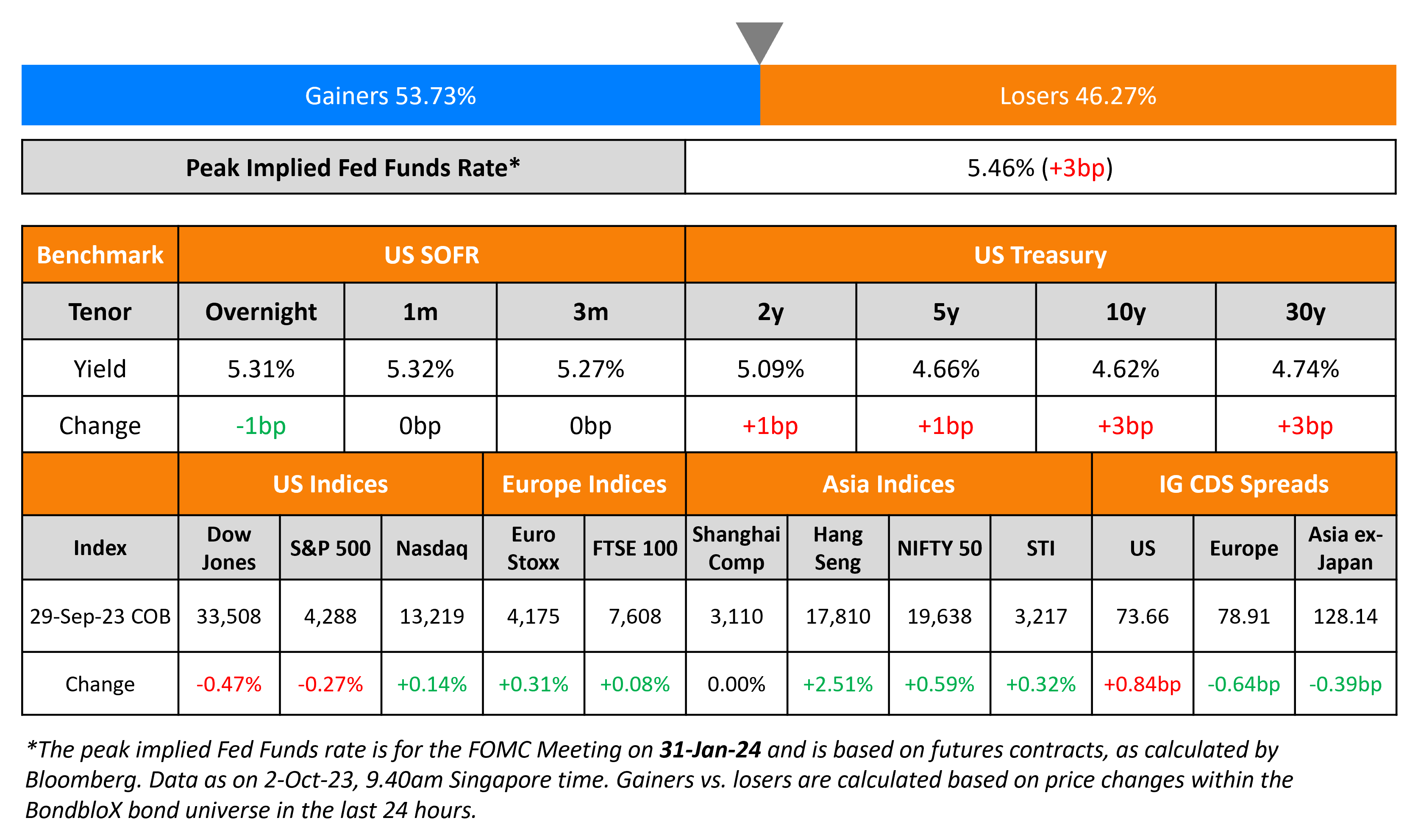 US Treasury yields were stable on Friday after a volatile week. The US Congress managed to avert a government shutdown just in time whilst passing a legislation to keep the government running until November 17. The peak fed funds rate rose 3bp to 5.46%. In credit markets, US IG CDS spreads were 0.8bp wider while HY spreads widened 7.8bp. US equities were mixed with the S&P down 0.3% and Nasdaq up 0.1%.