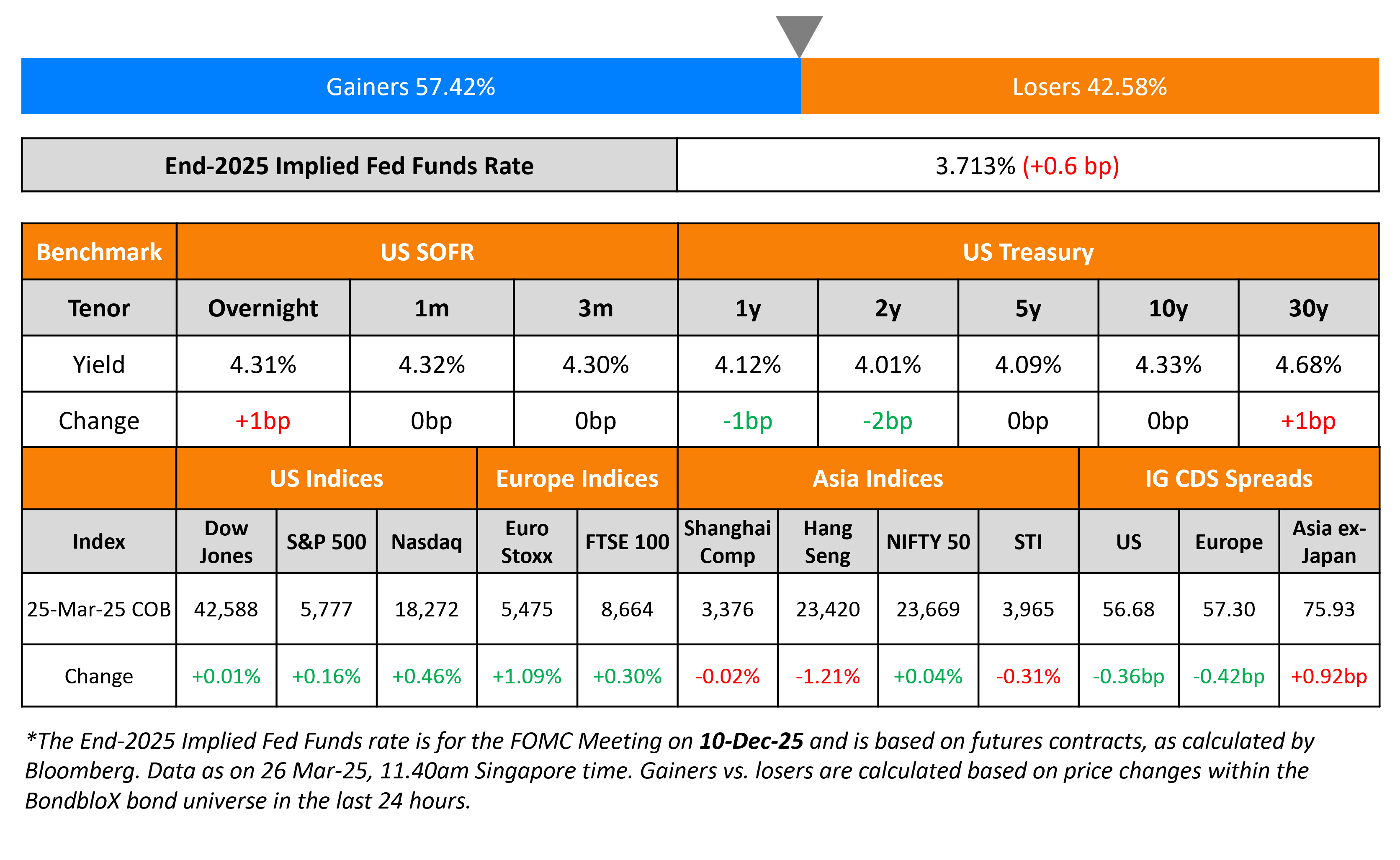 US Treasury yields were steady across the curve. The US Conference Board Consumer Confidence Index fell to its lowest level in four years to 92.9, and lower than expectations of 94.0. This also marks a fourth successive decline in the reading since the recent high of 112.8 seen in November 2024. To recall Fed Chairman Powell’s comments in last week’s FOMC meeting, he said that hard data indicated a solid economy while the weak consumer sentiment surveys may have been outliers. Separately, the US Treasury saw strong demand at its auction of the 2Y note.