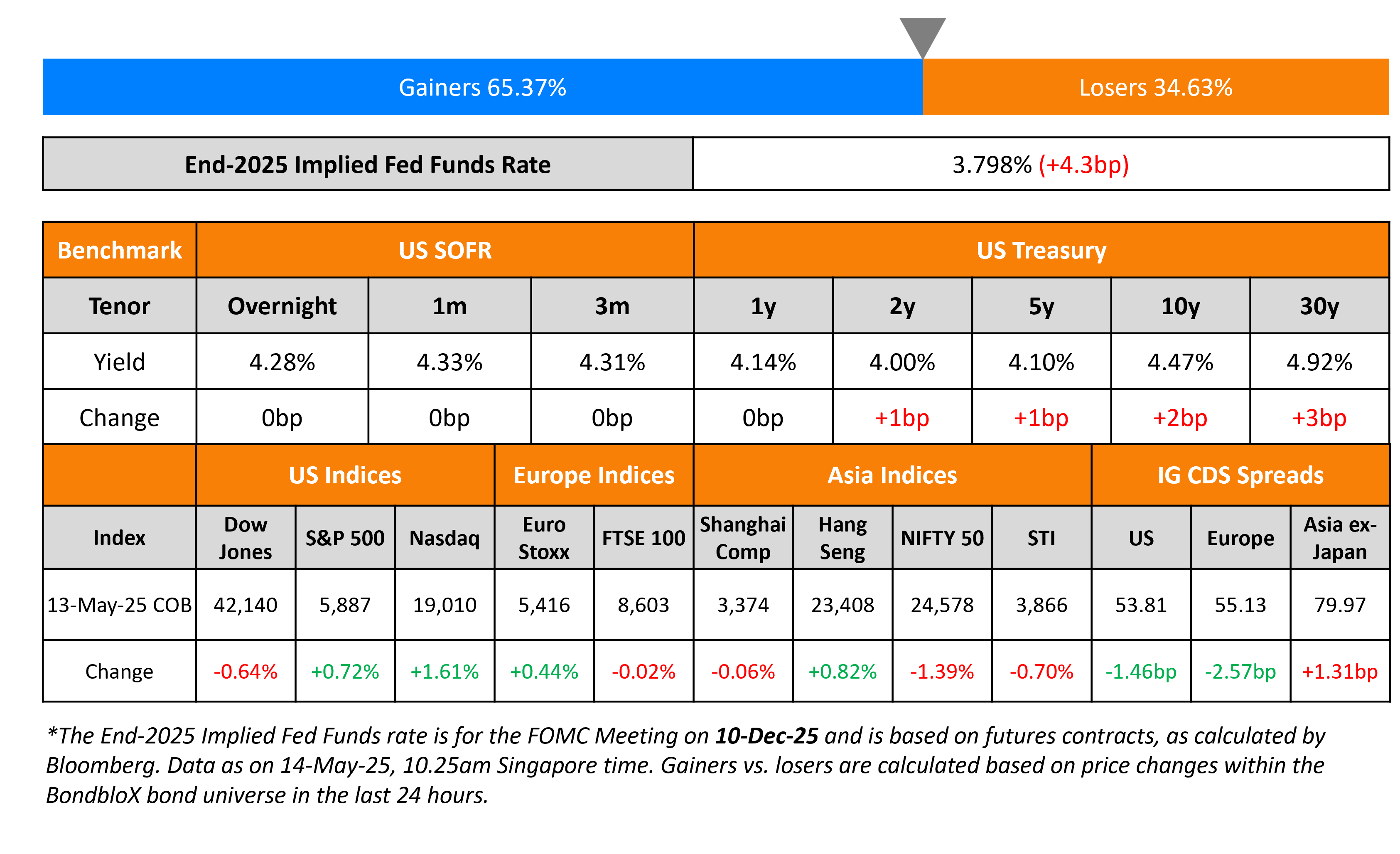 US Treasury yields jumped higher by 10-12bp across the curve. US CPI YoY for April came-in at 2.3%, softer than expectations and the prior month’s reading of 2.4%. Core CPI came-in at 2.8%, in-line with expectations. As part of US President Donald Trump’s visit to the Gulf, Saudi Arabia committed a $600bn investment initiative in the US.