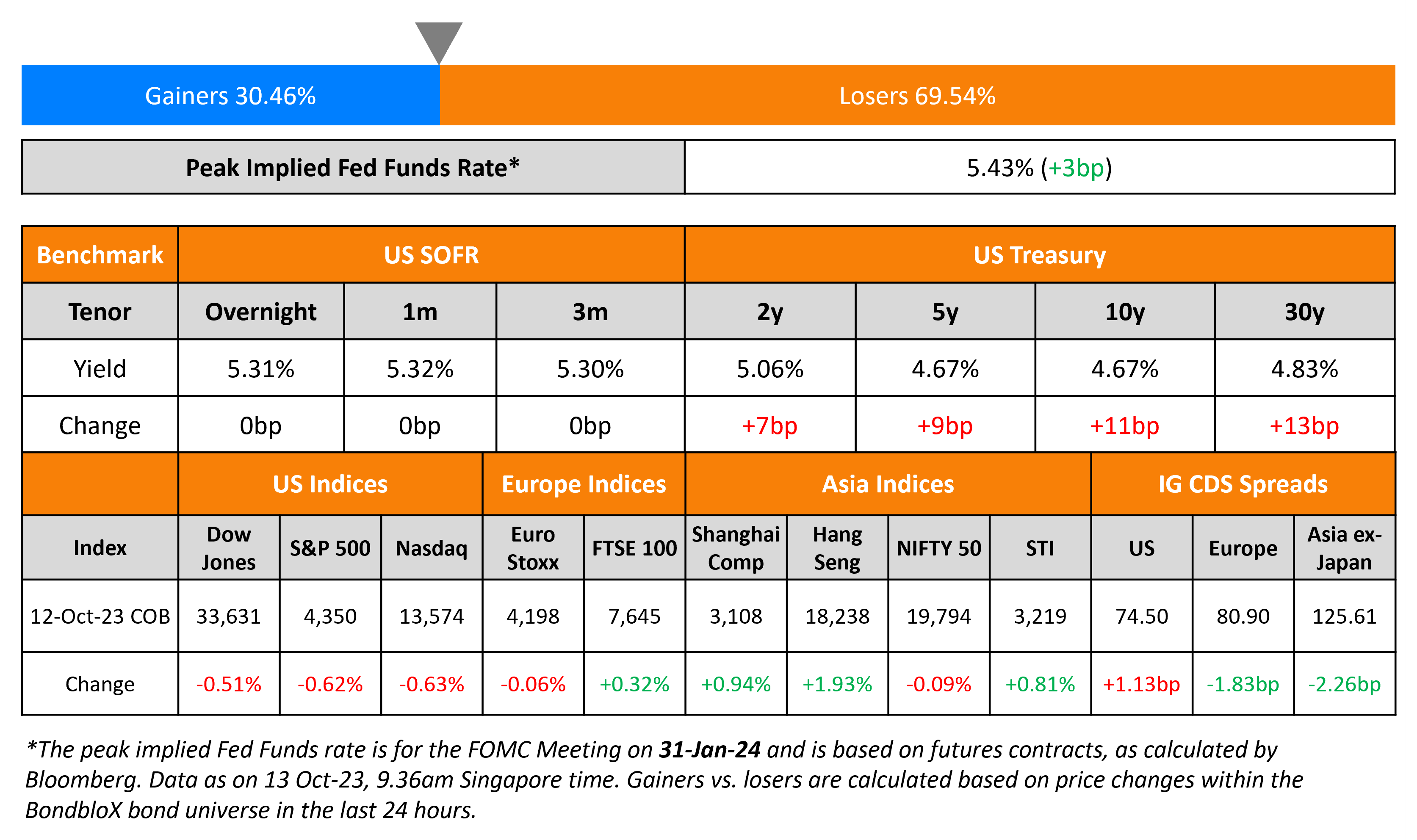 US Treasury yields surged across the curve after September’s higher than expected CPI print and a weak auction of 30Y bonds. The 2Y yield rose 7bp and the 10Y was up 11bp. US Headline CPI came at 3.7% YoY for September, higher than estimates of 3.6% while Core CPI was in-line with estimates at 4.1%. Besides, the US Treasury sold $20bn of 30Y bonds in its auction, with dealers taking up 18% of the supply, more than the average of 11%. The US Treasury’s 30Y sale tailed (auction take-up yield was higher than the expected yield at the bidding deadline) by 3.7bp at 4.837%, implying that investors sought a yield premium for the new notes. Separately, US initial jobless claims came in at 209k, slightly below estimates of 210k. US credit markets saw IG CDS spreads widening 1.1bp and HY spreads wider by 9bp. US equities moved lower with the S&P and Nasdaq down by 0.6%.
