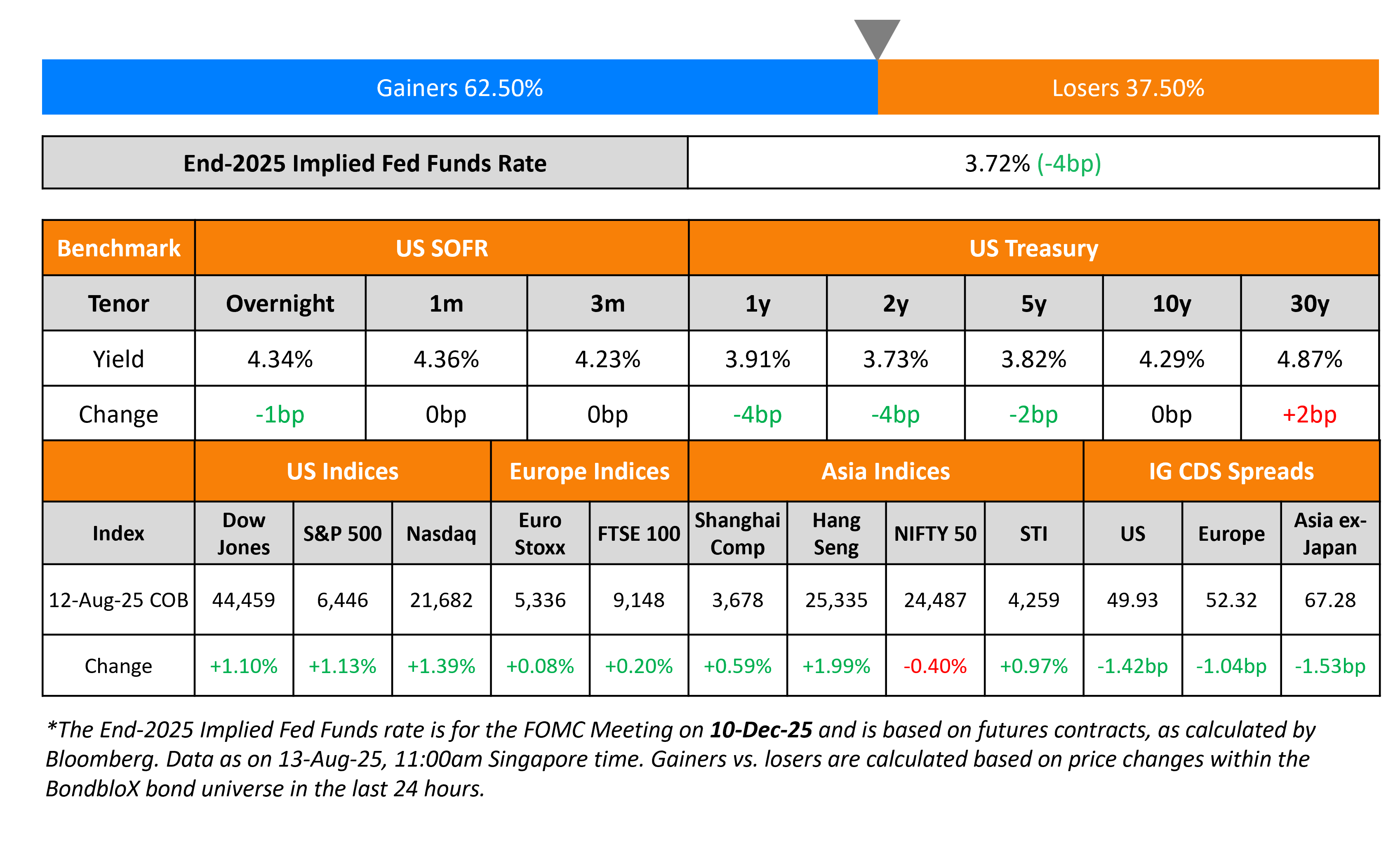 The US Treasury curve bull steepened on Tuesday, with the 2Y yield down by 4bp while the long-end remained steady. The Headline and Core CPI reading showed a moderation in inflation. US CPI YoY for July rose by 2.7%, softer than expectations of 2.8% and in-line with the prior month’s print. Core CPI rose by 3.1%, higher than the surveyed 3.0% and previous month’s 2.9% print. With this, markets continue to price-in ~60bp in rate cuts by the end of the year. As per CME interest rate probabilities, there is a 94% chance of a 25bp rate cut in the September FOMC meeting. However, Kansas City Fed President Jeff Schmid said that he favored keeping rates on hold for the time being, noting that he could change his view if demand growth started “weakening significantly”.