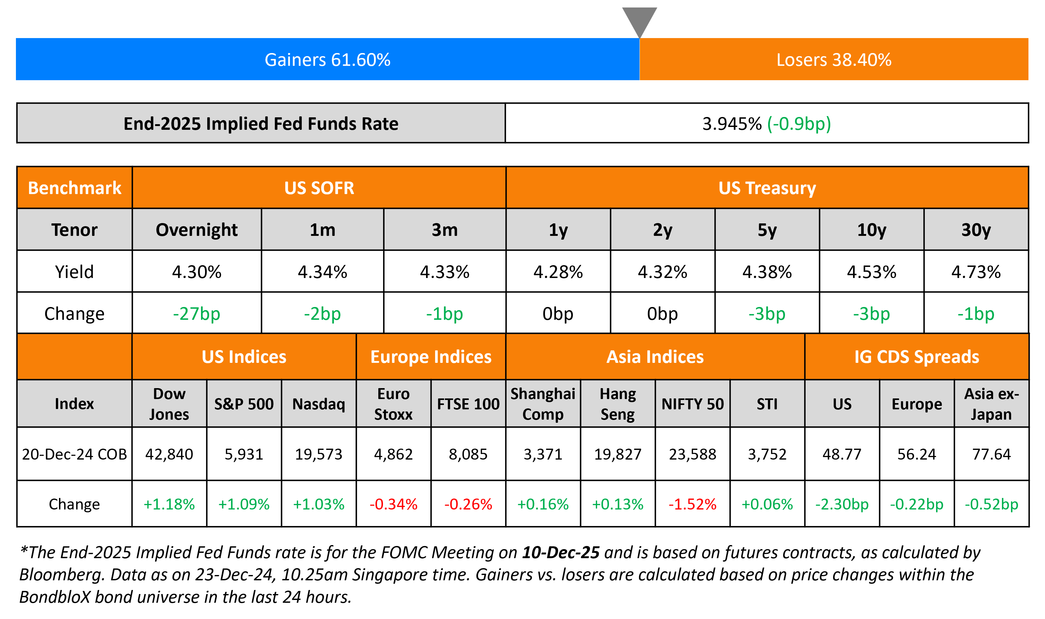 The US Treasury curve bull flattened on Friday, with the 10Y yield down ~3bp. The US government avoided a shutdown by signing a spending bill into law shortly after a midnight deadline. Going into year end, no major data points are due. US IG and HY CDS spreads tightened by 2.3bp and 11.5bp respectively. Looking at US equity markets, both the S&P and Nasdaq closed 1-1.1% higher on Friday. However, European equities ended lower. In terms of Europe’s CDS spreads, the iTraxx Main and Crossover spreads tightened by 2.5bp and 0.2bp respectively. Asian equities have opened higher this morning. Asia ex-Japan CDS spreads were 0.5bp tighter.