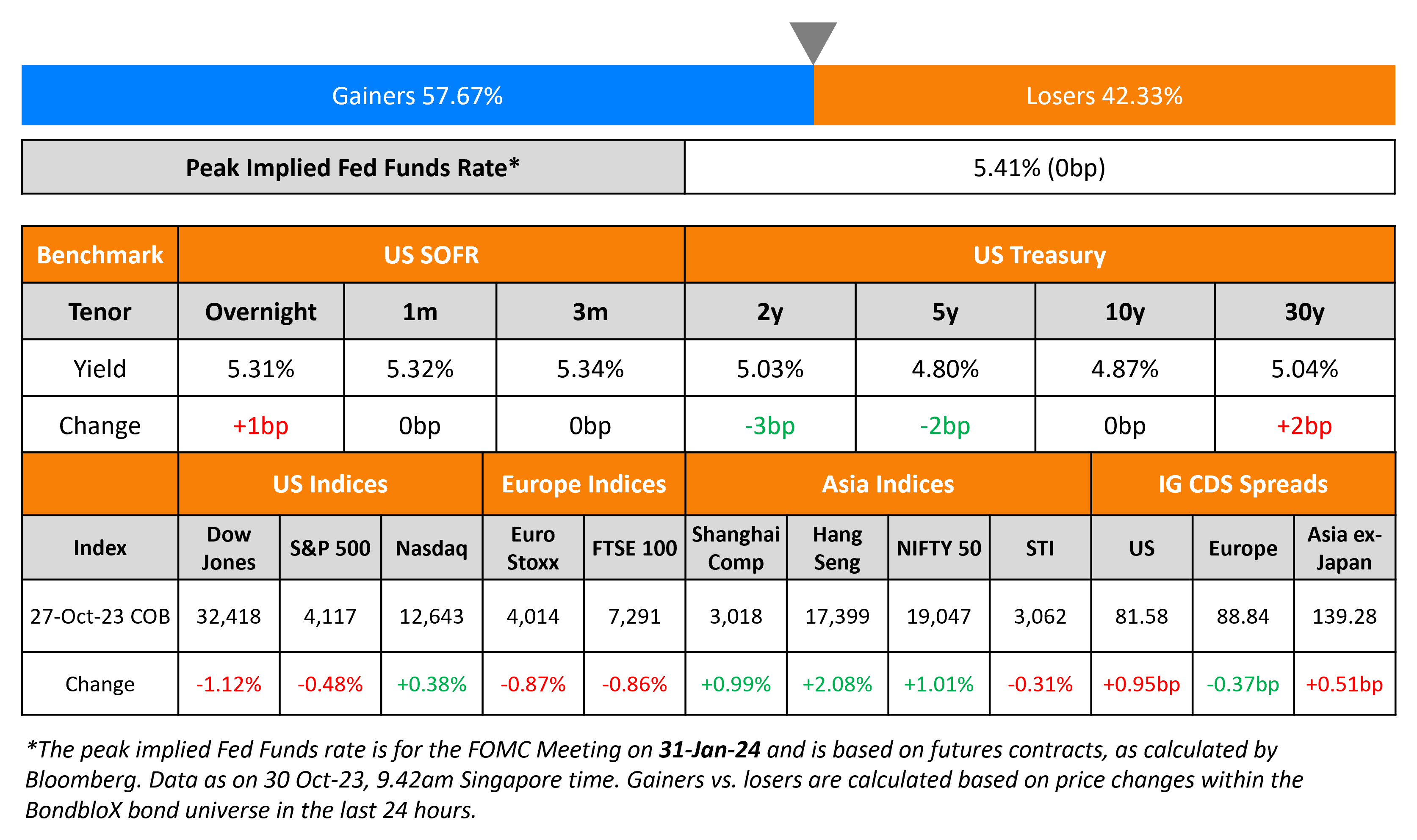 US Treasury yields were steady on Friday. On the economic data front, US headline PCE came at 3.4% and Core PCE at 3.7% in September, both, in-line with forecasts. US credit markets saw IG CDS spreads widen 1bp and HY spreads wider by 4.1bp. US equity markets were mixed, with the S&P down 0.5% and the Nasdaq up 0.4%. LSEG data showed that Q3 earnings in the US are expected to have increased 4.3% YoY. This is much higher than initial estimates that expected a 2.6% rise during this period. The data also noted that about 78% of the quarterly earnings are beating expectations vs. an average of 74% over last four quarters.