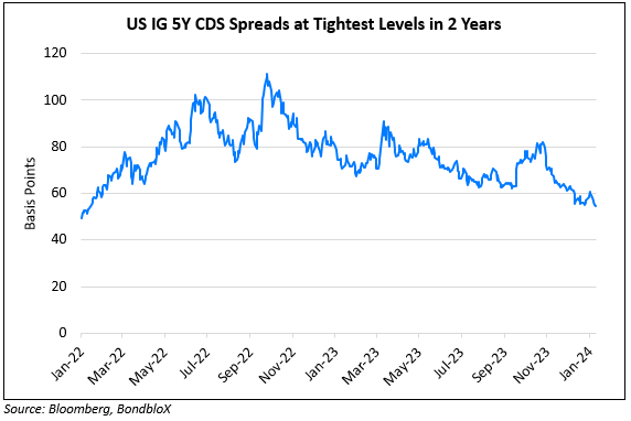 US Treasury yields dropped across the curve on Friday, with the front-end being impacted the most. The 2Y yield fell 12bp to 4.15% while the 10Y fell 4bp to 3.94%. US producer prices, as measured by the Producer Price Index (PPI) fell 0.1% MoM in December vs estimates of a 0.1% pick-up. On a YoY basis, it rose by 1% vs expectations of a 1.3% rise. Goods prices dropped 0.4%, going into deflation territory. Separately, oil prices have risen following the situation at the Red Sea. Brent crude touched $80/bbl and is currently at over $77.5/bbl. Looking at credit markets, US IG CDS spreads widened by 0.3bp and HY spreads widened 1.9bp. US equity markets traded broadly flat, with the S&P and Nasdaq ending almost unchanged on Friday.