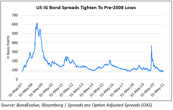 US corporate investment grade (IG) option-adjusted spreads (OAS) hit a 14Y low to 84bp over Treasuries. Spreads of both IG and high yield bonds (HY) have been moving lower and the news comes a few weeks after CCC-rated bond spreads hit a 13Y low last month. Bloomberg notes that better earnings, post-pandemic recovery and cheap borrowing costs have helped bring IG spreads to lows even as inflation fears have slowly creeped in. Some suggest that the move across credit markets is overdone with Morgan Stanley strategists saying, “The best days are behind… The combination of extended valuations, less favourable technicals and a slower pace of balance sheet repair suggests that credit markets have progressed to a mid-cycle environment”.