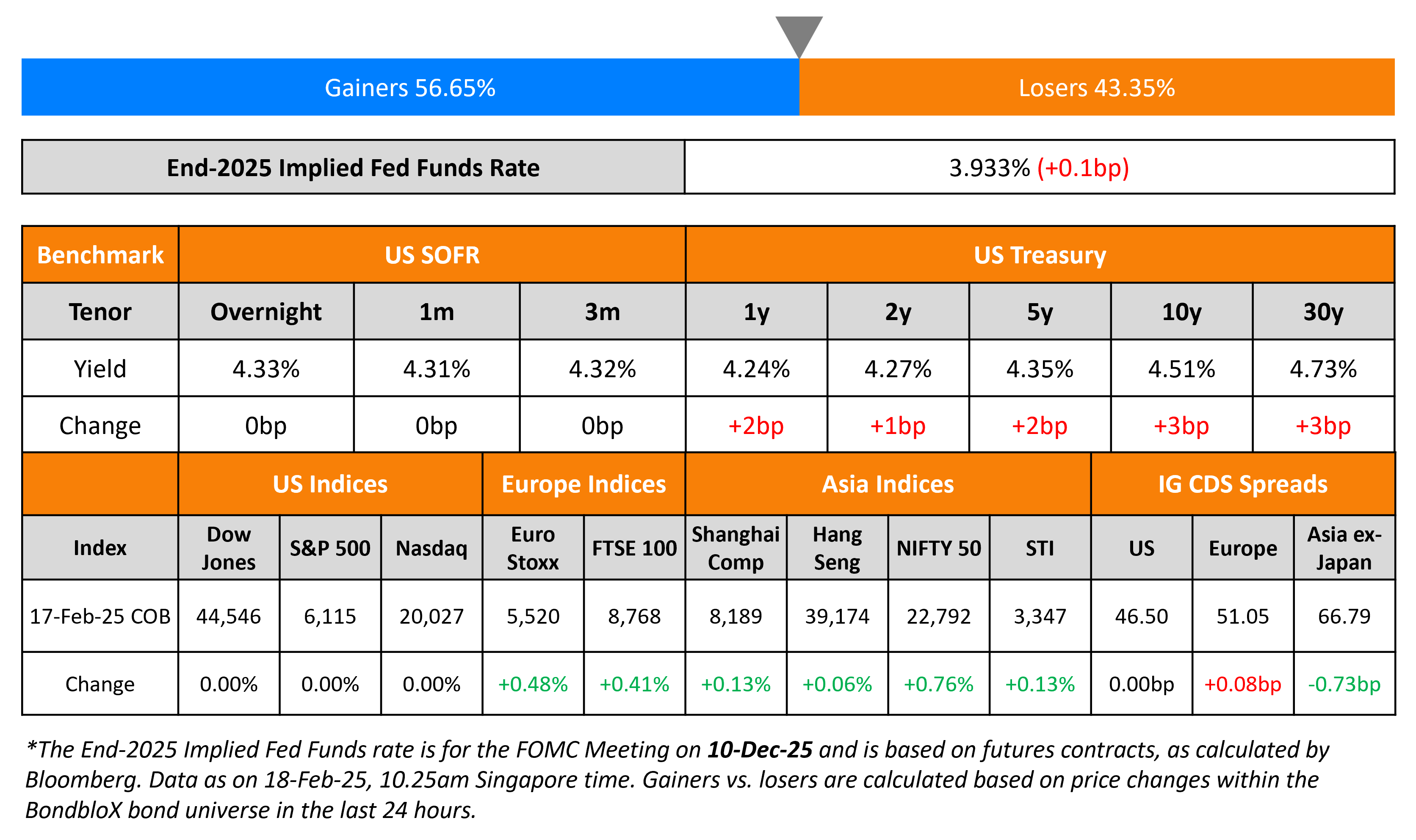 US Treasuries were closed yesterday on account of President’s Day. Philadelphia’s Fed President Patrick Harker sounded optimistic on the state of the US economy and saw no reason to change interest rate policy right now. He added that inflation will continue on a downward path and that the policy rate will be able to decline over the long run. However, Fed Reserve Governor Michelle Bowman wanted increased conviction that inflation will decline further this year before lowering interest rates again, particularly given the uncertainty around the Trump administration’s new trade and other policies. Another Fed Reserve Governor, Christopher Waller too favored a pause on interest rate cuts until the uptick in inflation, based on recent economic figures, eases.