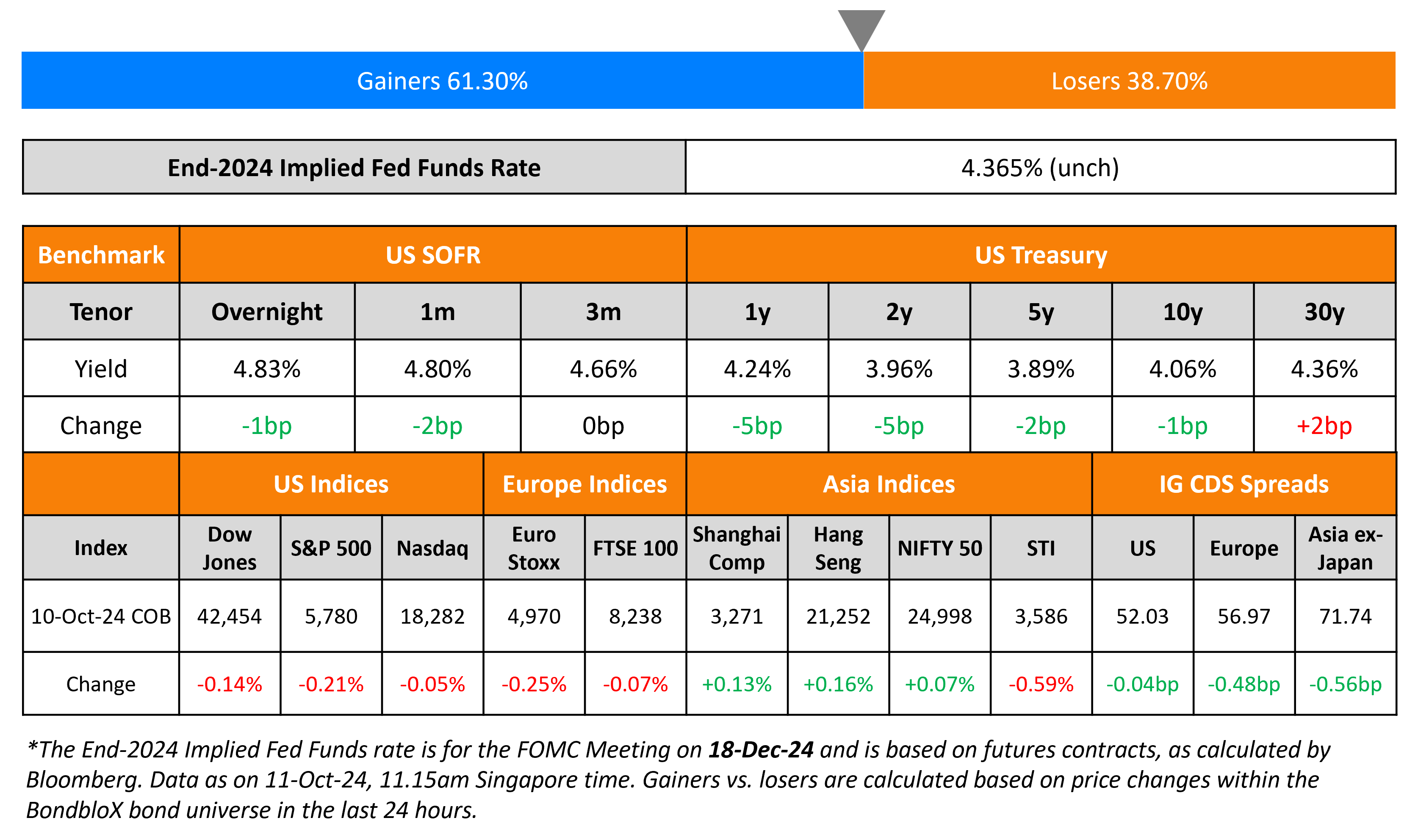 US Treasuries bull steepened, with short-end yields falling by about 5bp and long-term yields remaining largely stable. Key inflation figures for September were released yesterday. US Headline CPI decelerated to 2.4% YoY from the prior 2.5% print, but was higher than expectations of 2.3%. Core CPI came in higher than both initial expectations and the prior reading, at 3.3%. Following this, a few Fed officials offered their views – John Williams, Austan Goolsbee and Thomas Barkin, the Federal Reserve Presidents of New York, Chicago and Richmond respectively, all commented that inflation had continued to head in the right direction. Thus they beleive that the Fed can continue to lower rates. Atlanta Fed’s Bostic added that he might favor a pause at the next FOMC meeting. Separately, the US Treasury saw a solid 30Y auction with a strong indirect acceptance of 80.5% and a bid-to-cover ratio at 2.5x, stronger than the prior auction’s 2.38x. US IG CDS spread were flat while the HY CDS spread widened by 0.8bp. Looking at US equity markets, S&P and Nasdaq both closed lower by 0.2% and 0.1% respectively.
