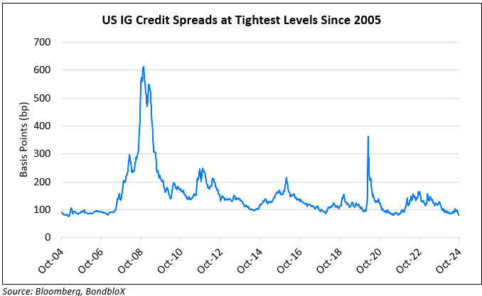 US Treasury yields were higher across the curve on the back of continued resilience in economic data. US Retail Sales for September rose by 0.4%, better than estimates of 0.3% and the prior month’s 0.1% print. Core Retail Sales grew 0.7%, again better than estimates and the prior print of 0.3%. The Philadelphia Fed Business Outlook print came in at 10.3 vs. expectations of 0.3. Also, initial jobless claims for the previous week rose by 241k as compared to expectations of 259k. Looking at US equity markets, S&P and Nasdaq both closed flat. US IG and HY CDS spreads widened by 0.2bp and 2.8bp respectively. US IG credit spreads are as measured by the option adjusted spread (Term of the Day, explained below), are currently at 79bp, their tightest levels since 2005.