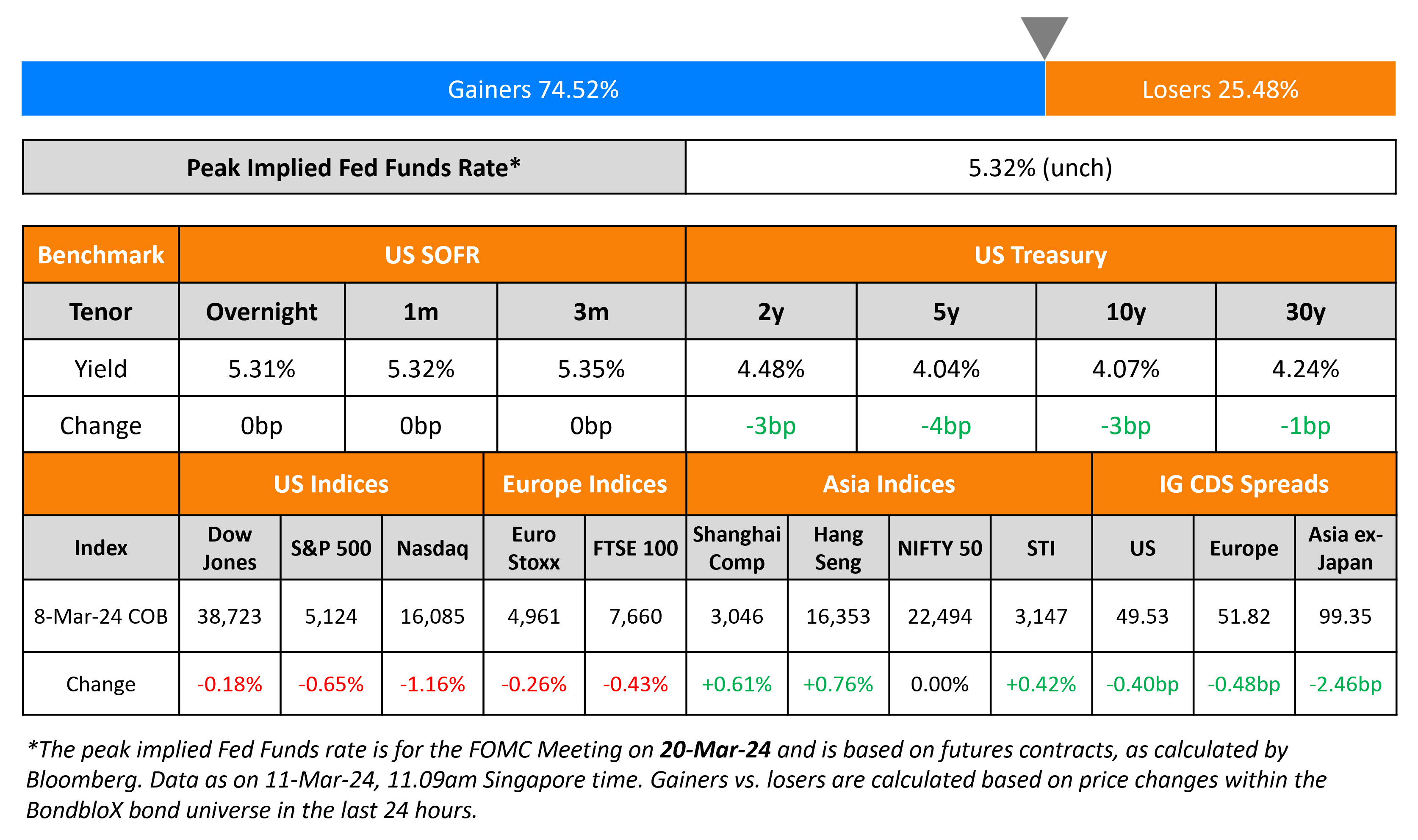 US Treasury yields moved ~3-4bp lower across the curve on Friday. US Non-Farm Payrolls (NFP) for February 2024 came at 275k, higher than the expected 200k. However, January’s NFP print was revised down to 229k from 353k. Average Hourly Earnings (AHE) YoY rose by 4.3%, inline with expectations of 4.3%. The unemployment rate rose to 3.9%, higher than the expected 3.7%. Separately, New York Fed President John Williams said that “the neutral rate is still quite low” in a remark whilst not commenting on monetary policy or the economic outlook. Looking at credit markets, US IG CDS spreads tightened 0.4bp and HY CDS spreads were 1bp tighter. Equity markets closed higher with the S&P and Nasdaq down 0.7% and 1.2% respectively.