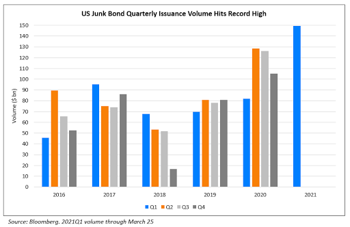 The recent flurry of new bond issues by US high yield issuers has led to a record issuance volume of $149bn for the quarter with a few days remaining until quarter-end. This beats the previous quarterly junk bond issuance volume of $128bn in Q2 last year when corporates rushed to raise capital in a bid to survive the impact of the pandemic.