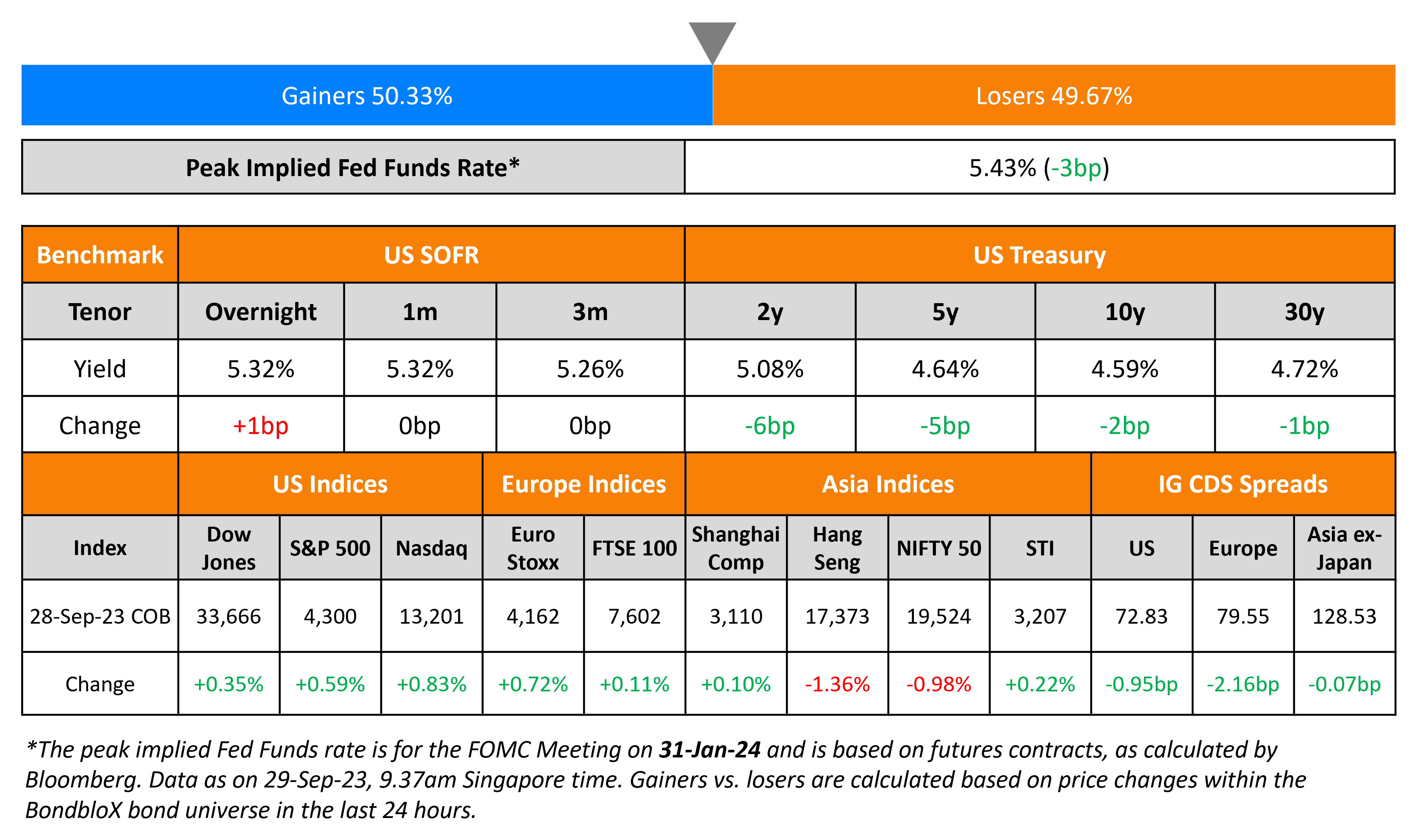 Volatility in US Treasury yields continued on Thursday. 2Y yields fell 6bp to 5.08% and the 10Y was down 2bp to 4.59%. The final print of US GDP in the third quarter came at an unrevised 2.1%, indicating continued resilience in the economy. Initial jobless claims for the prior week dropped to 204k vs. the forecasted 215k rise. However, the manufacturing sector stayed relatively weak with the Kansas Fed Manufacturing Index at -8 as compared to the expected -2 print. The peak fed funds rate fell 3bp to 5.43%. In credit markets, US IG CDS spreads were 1bp tighter while HY spreads tightened 10.3bp. The S&P and Nasdaq moved higher by 0.6-0.8%.