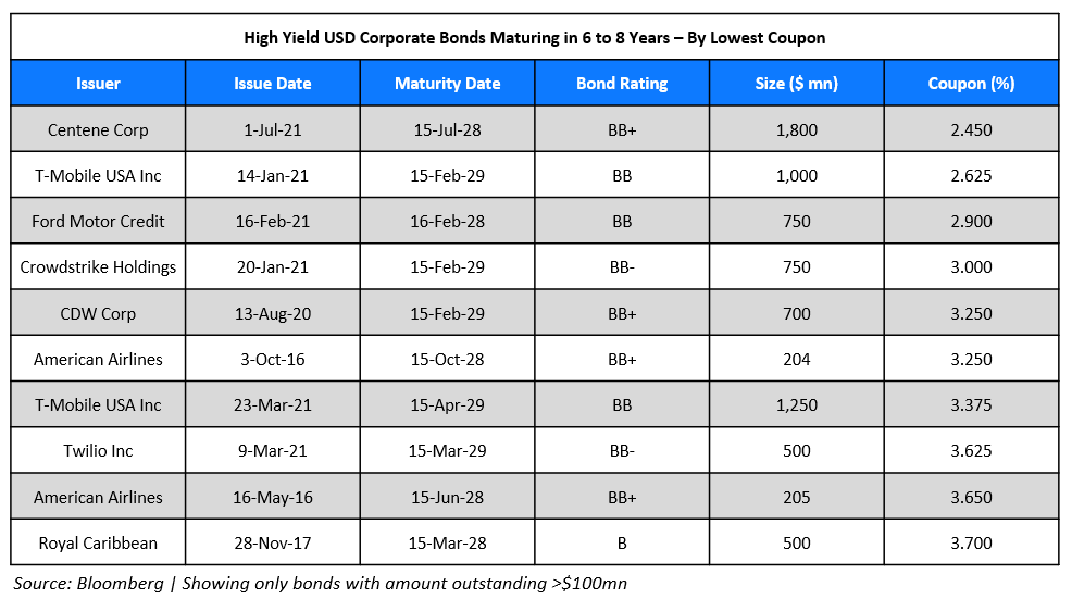 US junk or high yield (HY) bond coupons hit a record low with Centene Corp’s $1.8bn 7Y bond that was issued to offer a coupon of 2.45%. While Centene is considered investment grade with issuer ratings of BBB-/BBB-/Ba1, its new 7Y bond that set the record for the lowest coupon is considered high yield as it is rated BB+/Ba1 by Fitch/Moody’s and BBB- by S&P. HY issuance volumes MTD are at $34bn and saw a record $47bn in issuances in May, the highest ever for the month of May in any year. Bloomberg reports that low funding costs and an increase in oil prices have encouraged companies to seek access to debt capital markets. The supply is met with strong demand from investors despite concerns on inflation picking up, which can cause price losses, Bloomberg notes. HY bonds’ yield-to-worst based on the Bloomberg-Barclays US Corporate HY Index currently stands around record lows of ~3.87%.