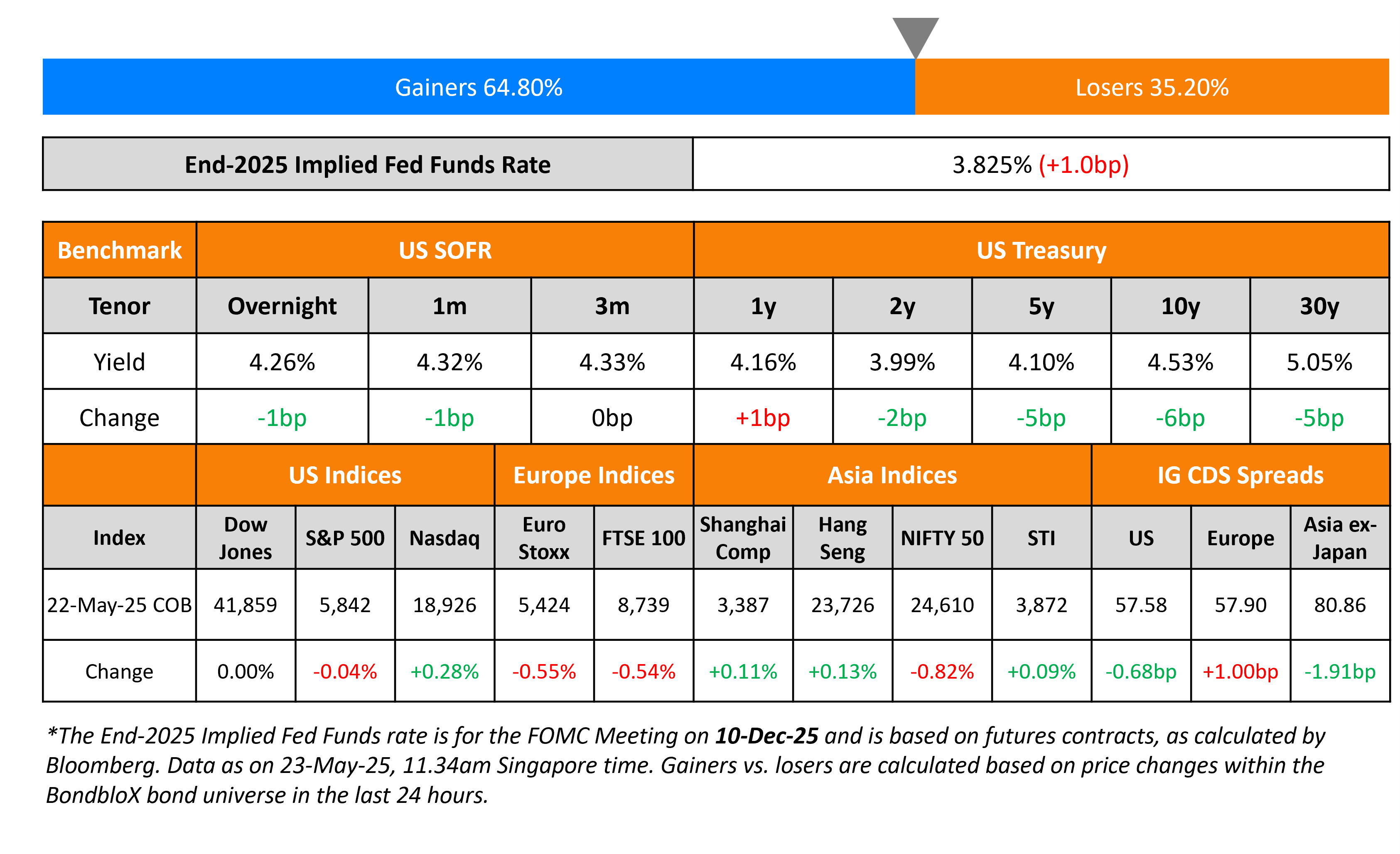 US Treasury yields pulled back across the curve after having jumped higher over the three prior sessions. On Thursday, the 10Y yield eased by 6bp to 4.53% and the 2Y eased by 2bp to 3.99%. On the data front, initial jobless claims for the previous week rose by 227k, better than expectations of 230k. The preliminary S&P US PMIs came-in better than expected – both the Manufacturing and Services PMI came-in at 52.3 each vs. estimates of 49.9 and 51.0 respectively. Separately, US President Donald Trump’s tax-cut bill was approved in the House with a 215-214 vote. Regarding the next stages, it also requires an approval in the Senate before being signed into law.