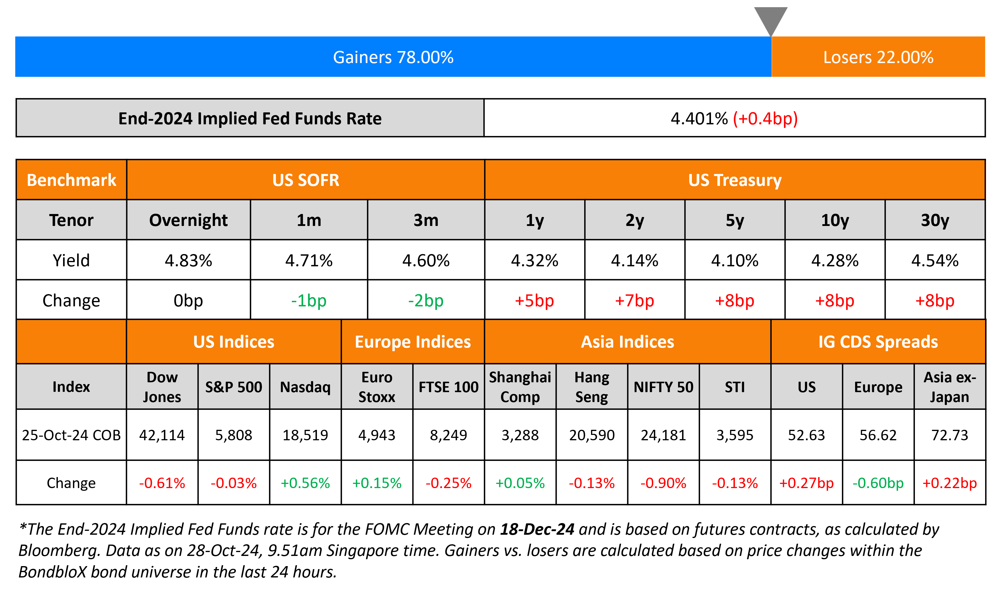 US Treasuries continued their down move after a day of pullback with yields up by 7-8bp across the curve. The move came on the back of investors doubling down on the “Trump trade”, as they begin pricing in greater odds of increasing fiscal deficits leading to more government borrowing, as well as tariffs that would significantly add to inflationary pressures. Aside from this, preliminary durable goods orders data came in strong for the month of September at -0.8%, higher than the estimates of -1.0%. The value excluding transportation came in at 0.4%, greater than the expected 0.1% drop. US IG and HY CDS spreads widened by 0.3bp and 2.1bp respectively. Looking at US equity markets, the S&P closed largely stable, while Nasdaq closed higher by 0.6%.