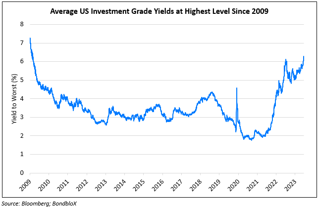 US Treasuries extended their sell-off on Tuesday as yields soared on the long-end. The 10Y and 30Y yields were up over 14-16bp while the 2Y was up 4bp as the curve bear steepened. US JOLTS Job Openings jumped to 9.6mn in August, much higher than forecasts of 8.8mn continuing to imply a resilient economy and further strengthening the ‘higher for longer’ theme. Separately, the average yield on US investment grade bonds have now hit 6.27%, the highest since 2009 (as seen in the chart below). Meanwhile, the average yield on US high yield bonds have touched 9% for the first time since June, with credit spreads hovering at ~400bp over treasuries. In credit markets, US IG CDS spreads were 3.3bp wider while HY spreads widened 20bp. US equities dropped with the S&P and Nasdaq down 1.4% and 1.9% respectively.