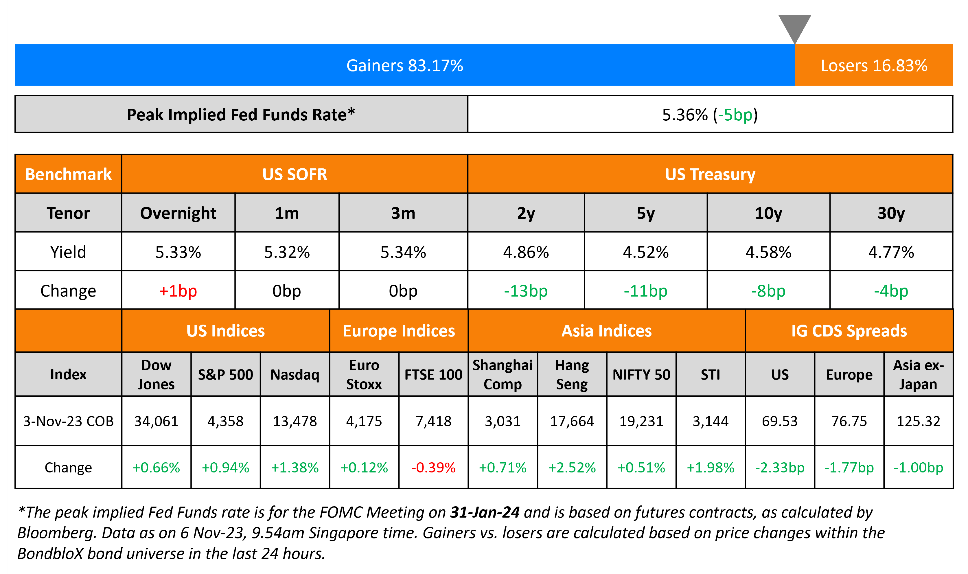 US Treasuries rallied on Friday, following the jobs data, with the 2Y yield down 13bp and the 10Y yield down 8bp. The Peak Fed Funds Rate was down 5bp. US NFP for October rose by 150k, lower than the surveyed 180k and last month’s 336k. The Unemployment Rate was at 3.9%, higher than the surveyed 3.8%. Average Hourly Earnings YoY was at 4.1%, higher than the surveyed 4.0%. Also, US ISM Services came at 51.8 for October, lower than the estimated 53 and prior month’s 53.6. US credit markets continued to tighten – IG CDS spreads tightened 2.3bp and HY spreads tightened by 14.1bp. S&P and Nasdaq rose 0.9% and 1.9% respectively.