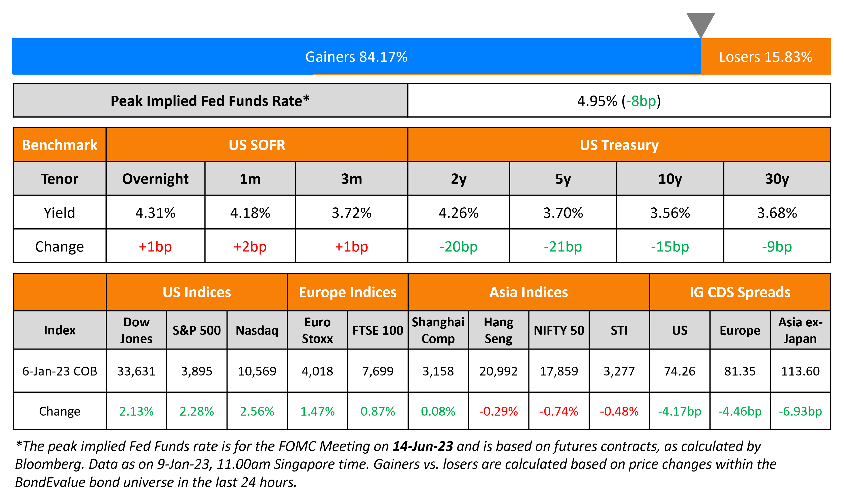 US Treasuries saw a massive rally on Friday with yields dropping by over 20bp across the 2Y and 5Y while 10Y yields fell 15bp. The move occurred after the keenly awaited jobs report numbers came out. US Non-Farm Payrolls (NFP) came at 223k for December, higher than the surveyed 202k but lower than last month’s revised 256k print. The unemployment rate was at 3.5%, higher than surveyed 3.7% but lower than last month’s revised 3.6%. However, bond markets were boosted as Average Hourly Earnings YoY fell to 4.6%, lower than the surveyed 5% and last month’s revised 4.8% print, implying a softening in wage inflation. Besides, the ISM Services PMI for December saw a contraction to 49.6, after 30 consecutive months of growth. Among this, the inflationary ‘Prices Paid’ component fell to 67.6 from 70 in November. Also, components like new orders and inventories saw a contraction at 45.2 and 45.1 respectively in December from 56 and 47.9 in the November. Both, the wage inflation and soft ISM Services data points saw market participants price in either a slower path to Fed rate hikes this year. All eyes now focus towards the CPI print that is expected at 6.5% for December, a drop from 7.1% in November. The data is due on January 12.