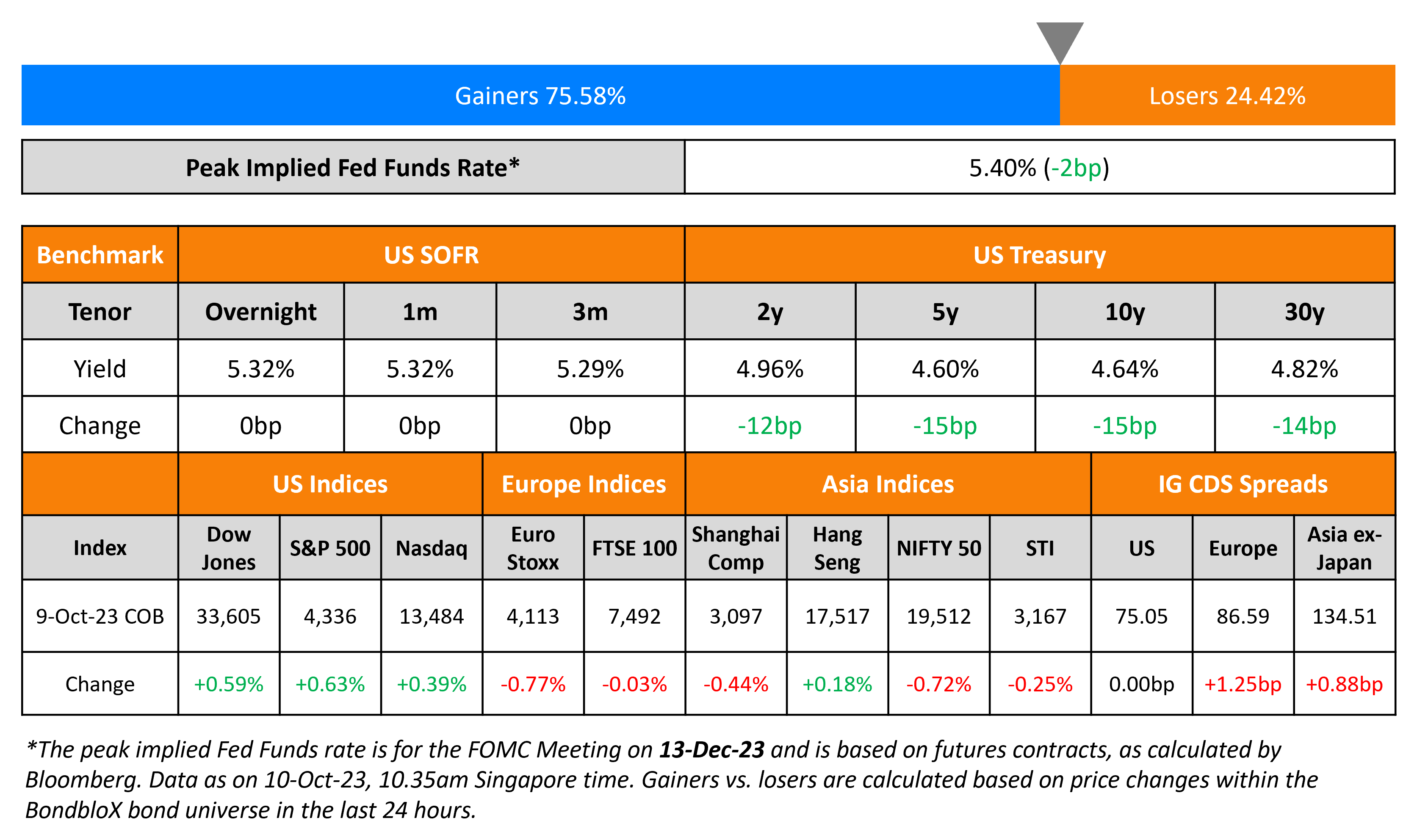 US Treasuries saw a sharp rally, the most since March as yields tumbled by 12-15bp across the curve. This was after the conflict in the Middle East fuelled a flight to safer assets alongside some dovish comments by Fed officials. Fed Vice Chair Philip Jefferson said that he would “remain cognizant of the tightening in financial conditions through higher bond yields” while voting member and Dallas Fed President Lorie Logan said the recent rise in long-term treasury yields may indicate less need for them to raise rates again. US credit markets were closed due to a bond market holiday. US equities jumped higher with the S&P and Nasdaq rising 0.6% and 0.4% respectively.