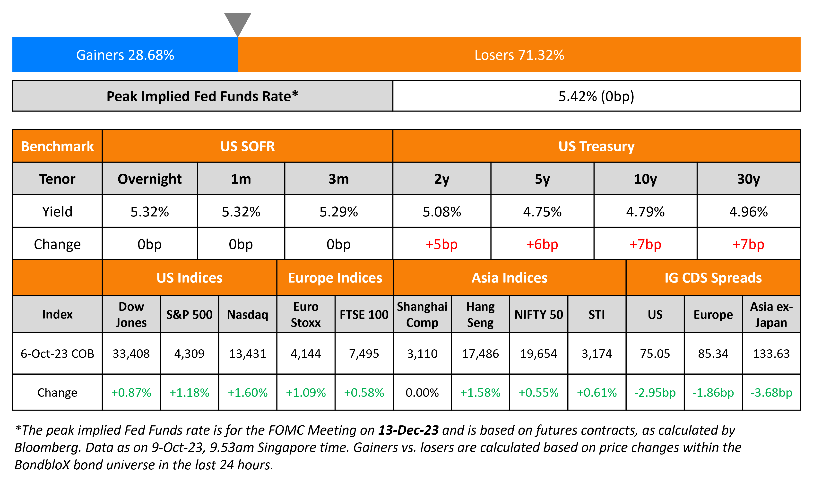 US Treasuries sold-off following the stronger-than-expected jobs report on Friday with yields higher by 5-7bp across the curve. US Non Farm Payrolls (NFP) came at 336k, significantly higher than the expected 170k and the Average Hourly Earnings (AHE) YoY print was at 4.2%, slightly lower than the expected 4.3%. The unemployment rate stood at 3.8%, higher than the surveyed 3.7%. In credit markets, US IG CDS spreads were 3bp tighter while HY spreads tightened 13bp. US equities jumped higher with the S&P and Nasdaq rising 1.2% and 1.6% respectively. Separately, oil prices jumped as sentiment deteriorated in the markets after the shock attacks by Hamas within Israel over the weekend. WTI Crude rose more than 4% to over $86/bbl Monday.