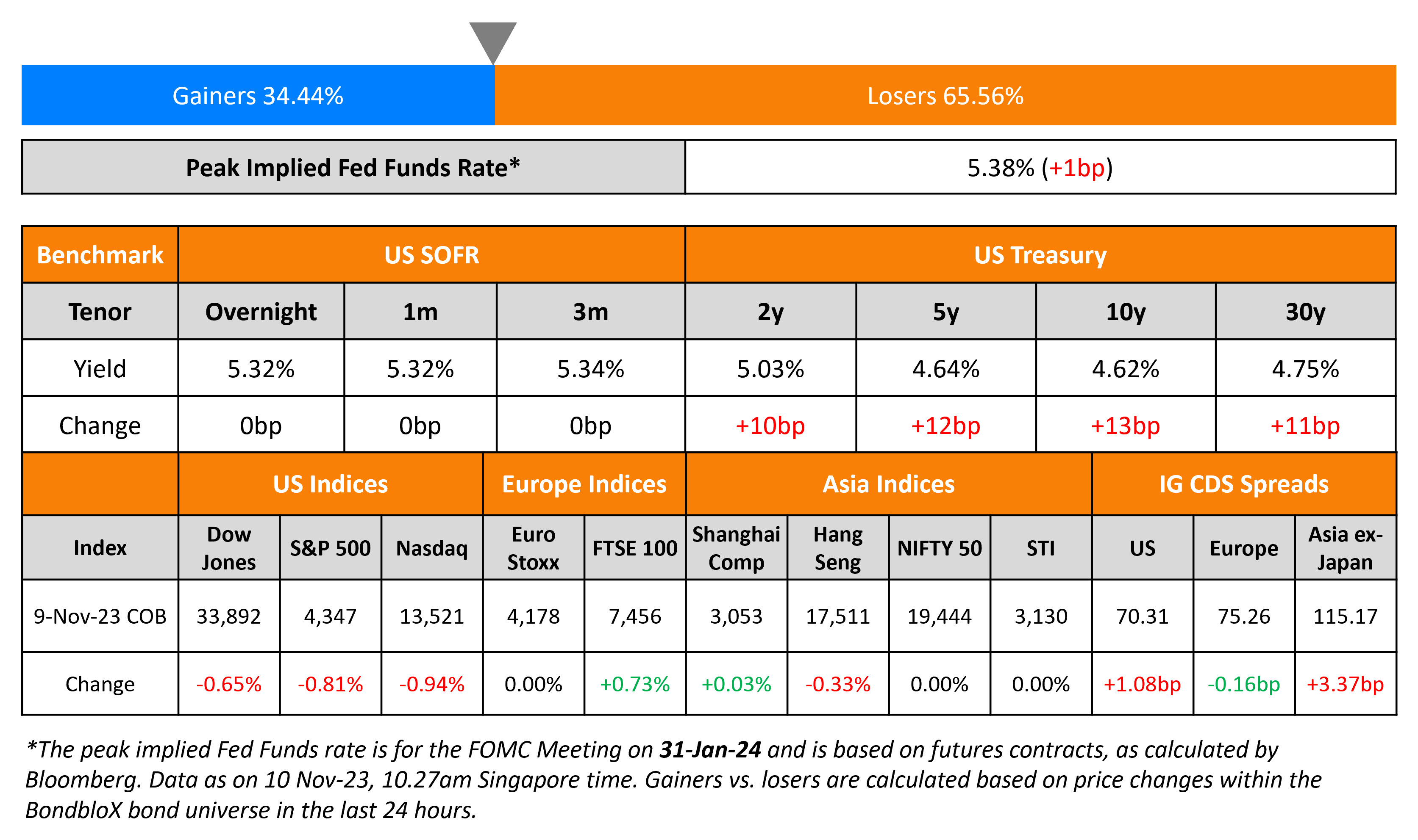 US Treasury yields rose sharply on Thursday up 10-13bp across the curve following a weak 30Y auction and Jerome Powell’s speech. The US Treasury’s $24bn auction of 30Y notes tailed by over 5.5bp with at a high yield of 4.769% and a bid-to-cover ratio of 2.24x, down from 2.35x in the October sale, and the three month average of 2.41x. Fed Chairman Jerome Powell made a hawkish remark saying, “if it becomes appropriate to tighten policy further, we will not hesitate to do so”, adding that the FOMC was not confident of having achieved their inflation stance”. US credit markets saw IG CDS spreads widening by 1.1bp while HY spreads tightened by 20bp. S&P rose and Nasdaq fell 0.8-0.9%.