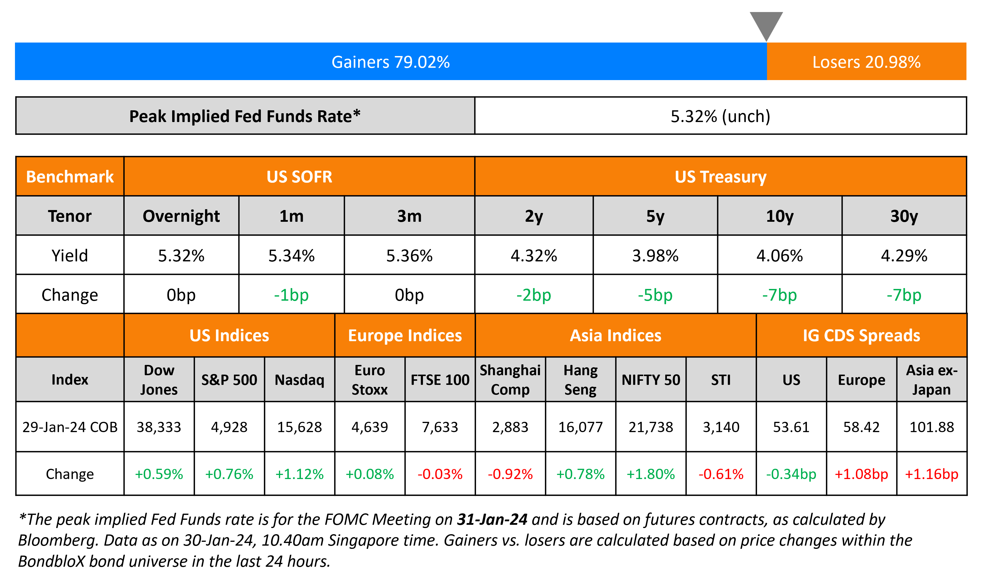 US Treasury yields moved lower by 5-7bp across the 5Y, 10Y and 30Y tenors on Monday. The move lower in yields came after the US Treasury reduced its federal borrowing estimate for 1Q 2024. This move was unexpected as it now estimates $760bn in net borrowing for the current quarter, down from a previous $816bn estimate released in late October 2023. Looking at credit markets, US IG CDS spreads tightened 0.3bp and HY spreads were 4bp tighter. Equity markets saw the S&P and Nasdaq rise 0.8% and 1.1% respectively.