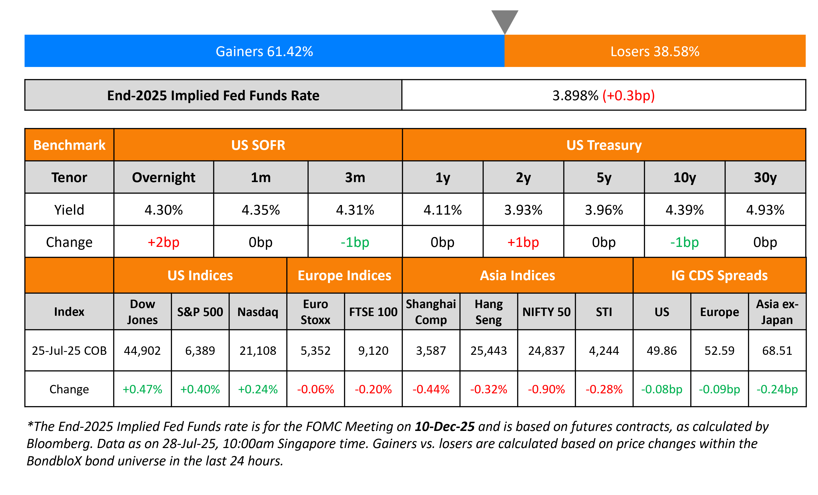 US Treasury yields were almost unchanged on Friday. US preliminary Durable Goods Orders for June saw a 9.3% drop, coming-in slightly better than expectations of a 10.7% drop, partly driven by lower orders for Boeing aircrafts. Core Durable Goods Orders rose by 0.2%, better than expectations of a 0.1% rise. A trade agreement between the US and the EU was finalised, with a 15% tariff to be imposed on most EU goods. Separately, the US and China will resume tariff talks, with some analysts expecting an extension of the pause on tariffs by another 90 days.