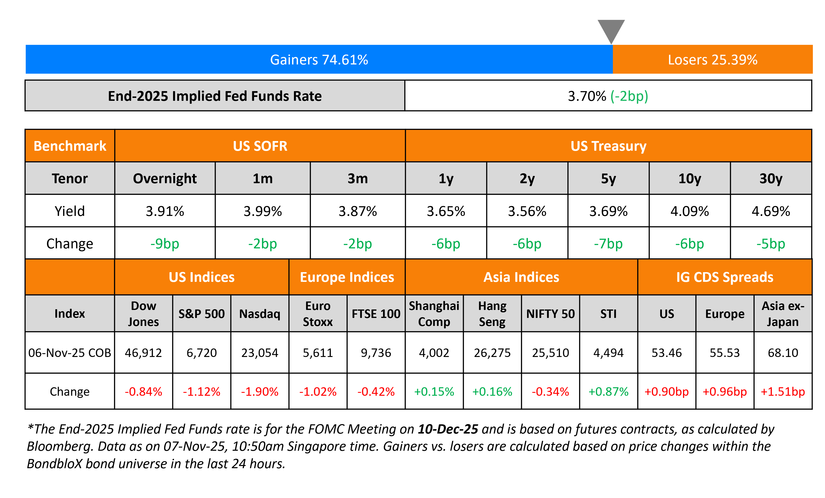 US Treasury yields retraced the move from a day earlier, falling by ~6-7bp yesterday. The risk sentiment deteriorated with the S&P and Nasdaq falling by 1.1% and 1.9% respectively. Separately, several Fed speakers spoke about their stance on monetary policy. Cleveland Fed President Beth Hammack highlighted her concerns about high inflation and said that “policy should be leaning against it”, adding that she “argues for a mildly restrictive stance”. St. Louis Fed President Alberto Musalem said that the Fed’s recent rate cuts were “appropriate”, but they should be careful to continue to lean against above-target inflation. Chicago Fed President Austan Goolsbee said that the lack of official inflation data during the government shutdown “accentuates” his caution about cutting rates. The Chicago Federal Reserve’s estimate for the unemployment rate in October climbed to 4.4% similar to September.