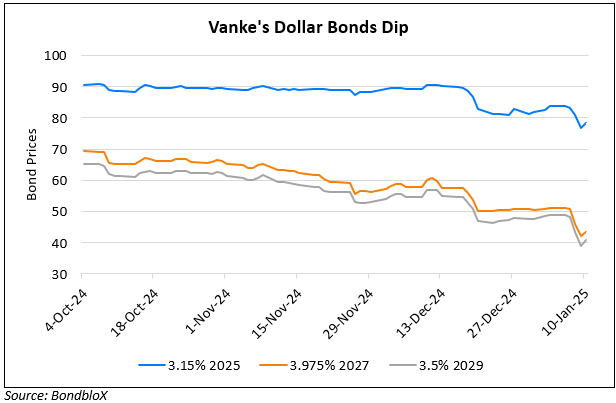 China Vanke faces about $4.9bn in local and offshore maturities/redemption options in 2025. This is the highest ever annual repayment due for Vanke, and also the most for any Chinese developer this year. Bloomberg notes that the dues also amount to more than half of its outstanding public debt. Some analysts have said that Vanke needs to secure new financing to avoid public debt defaults, noting that the market may not have priced-in the same. Vanke’s dollar bonds have traded lower since the start of the year (as seen in the chart below).