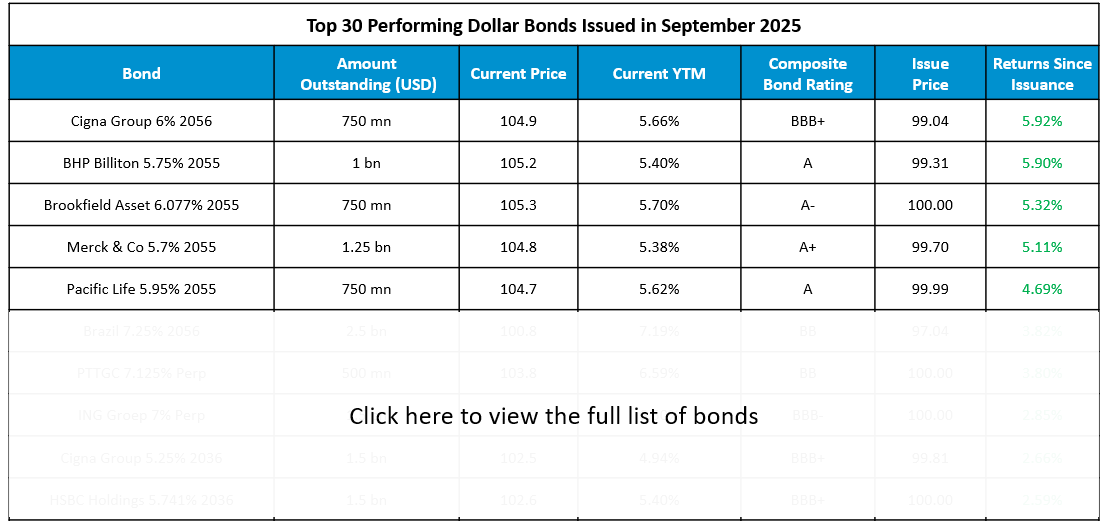 September 2025 has been a standout month in the primary bond market, with a surge in dollar bond issuances across sovereigns, corporates, and financial institutions. The deluge in issuance in September comes after a dry spell in August. Strong investor demand was evident as seen in several order books and the subsequent rally in bond prices post-issuance. The rally in bonds is also likely fueled by expectations of an imminent Fed rate cut in September and markets pricing-in nearly 70bp in rate cuts by year-end. Investors who subscribed to these new issues have already seen meaningful capital gains within weeks. In this regard, we have compiled a list of popular dollar bonds issued in September, sorted by their returns since issuance.