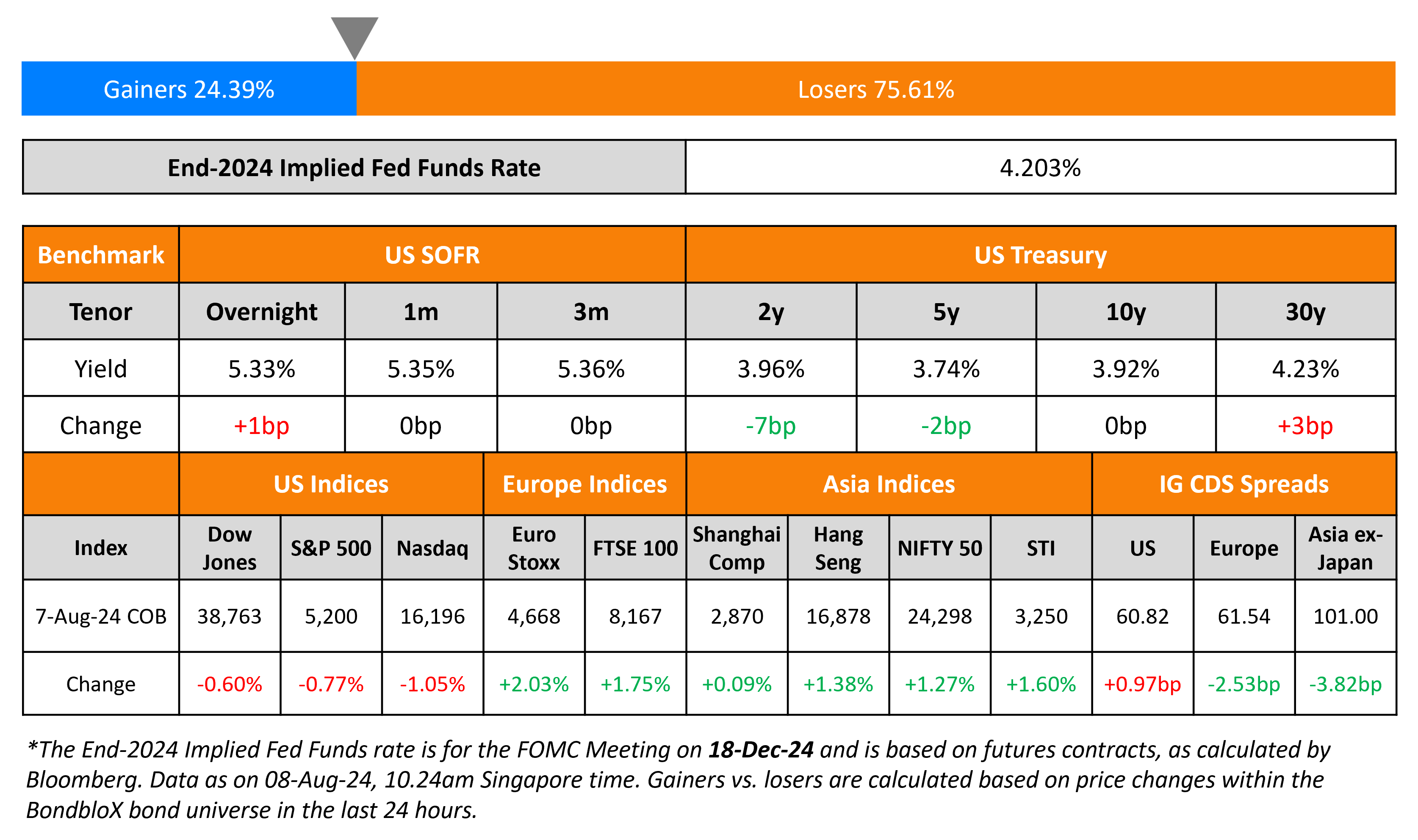 US Treasury yields were stable across the curve. The US Treasury’s $42bn 10Y bond auction saw weak demand, with a bid-to-cover ratio of 2.32x (vs. 2.58x in July) and an indirect bid acceptance rate of 66.2% (vs. 67.6% in July). The auction saw a final yield of 3.96%. US equities ended lower, with the S&P and Nasdaq down by 0.8% and 1.1% each. US IG and HY CDS spreads widened by 1bp each.