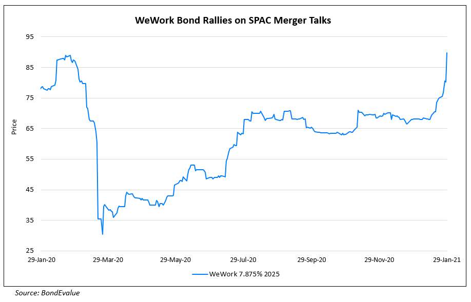 Co-working company WeWork saw its 7.875% bonds due 2025 jump 10 points on Thursday on news of the company going public via a merger with a special purpose acquisition company (SPAC). This comes about 16 months after WeWork’s failed IPO attempt. According to a person familiar with the matter that spoke to Bloomberg, WeWork’s board has received offers from various SPACs, also known as blank check companies, and is weighing that option vs. a private funding round. Marcelo Claure, WeWork’s executive chairman and COO of Softbank Group Corp said, “We have SPACs approaching us on a weekly basis. We’re humbled that is happening because a year ago, nobody wanted to even be associated with WeWork.” WSJ reported that the deal could potentially value WeWork at $10bn, significantly lower compared to its peak valuation of about $47bn two years ago. The company’s bonds took a beating last March, along with most other financial assets, when fears surrounding the pandemic were at its peak, falling as low as 35 cents on the dollar. It has since steadily recovered to trade at ~70 levels since August, before jumping further since January 20 to currently trade at 89.5 cents on the dollar, yielding 10.95%.
